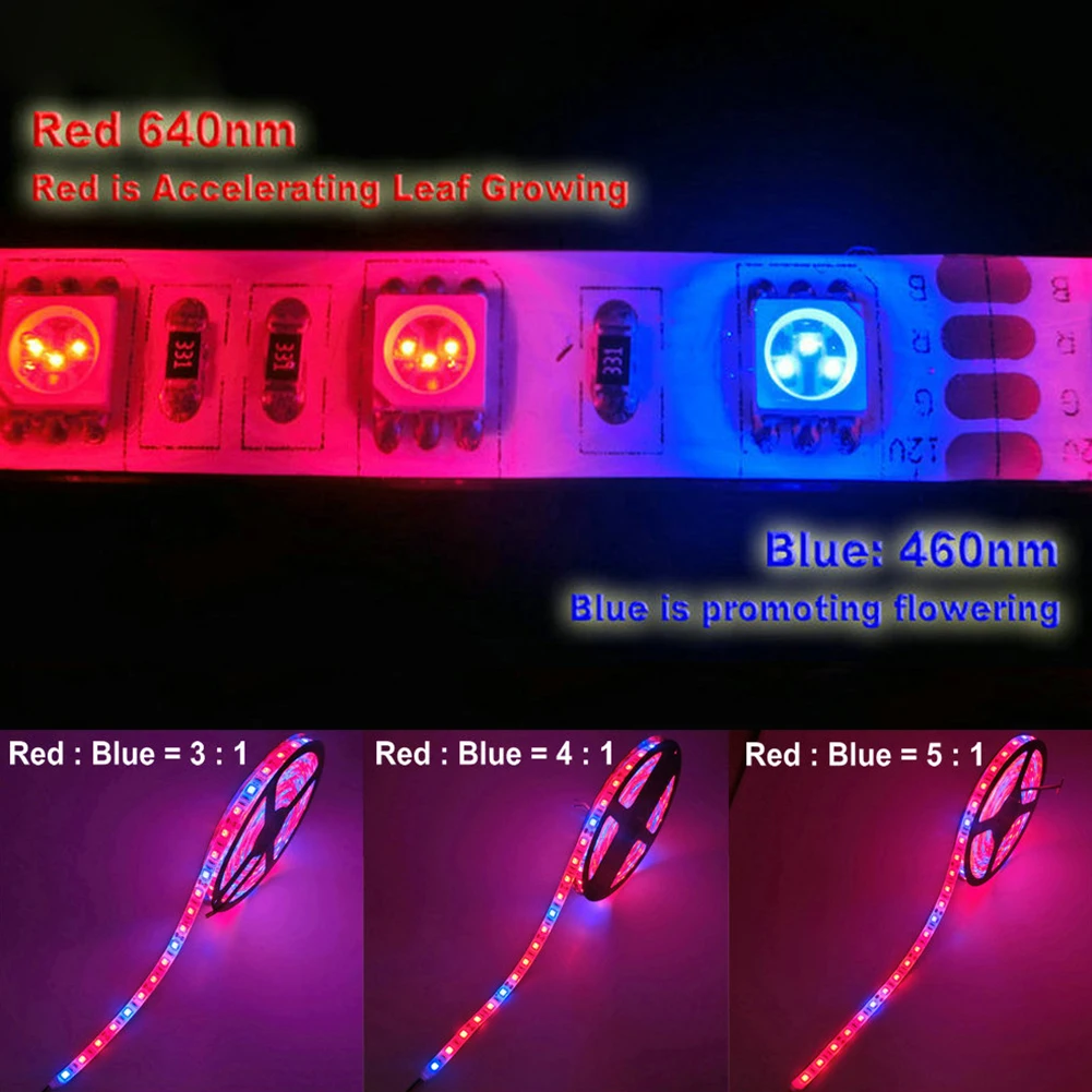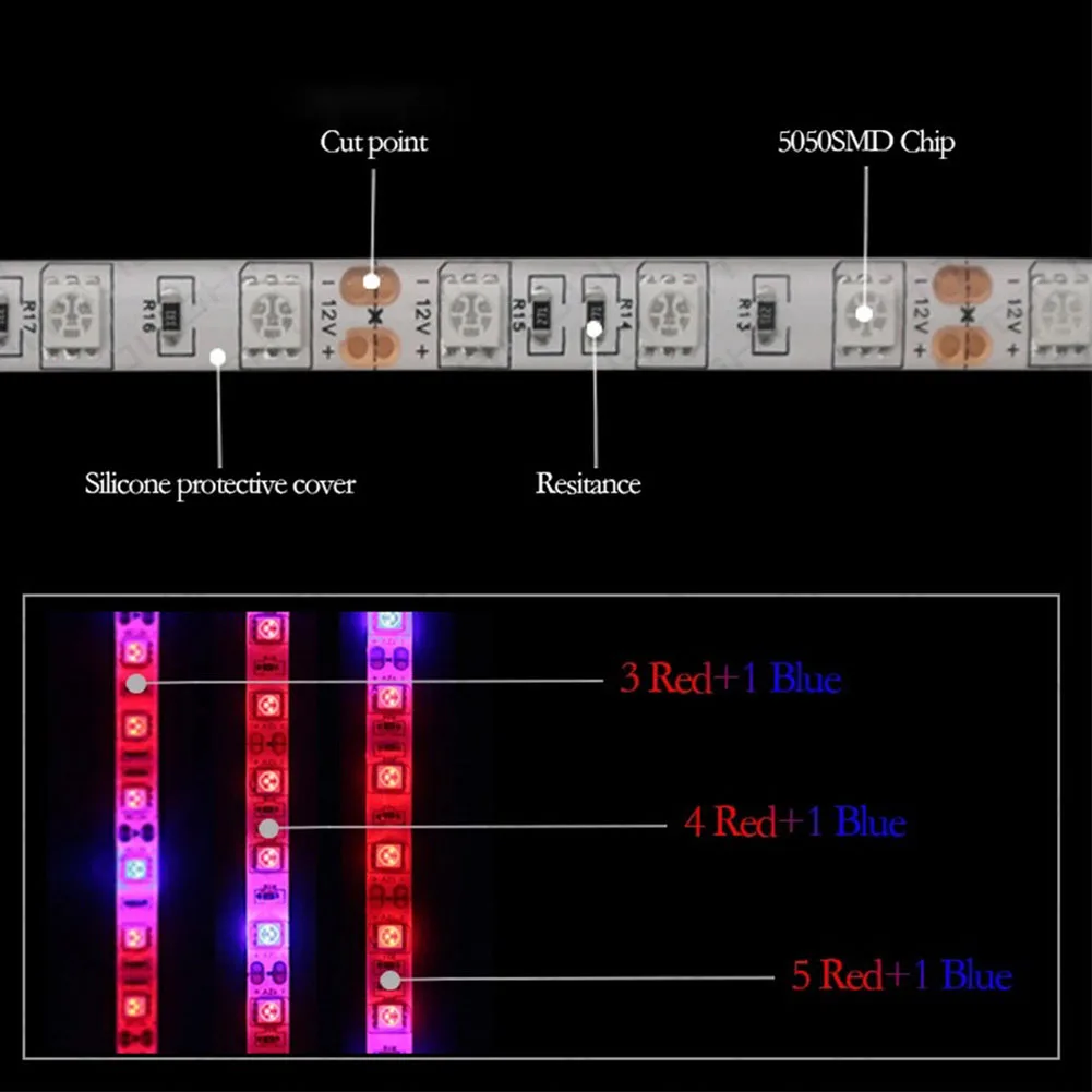 Светодиодная лента для выращивания растений, 5 м, 60 светодиодовм, 12 В, SMD 5050, красный, синий, 3:14:15:1, комнасветильник светильник, водонепроницаемая фитолампа полного спектра