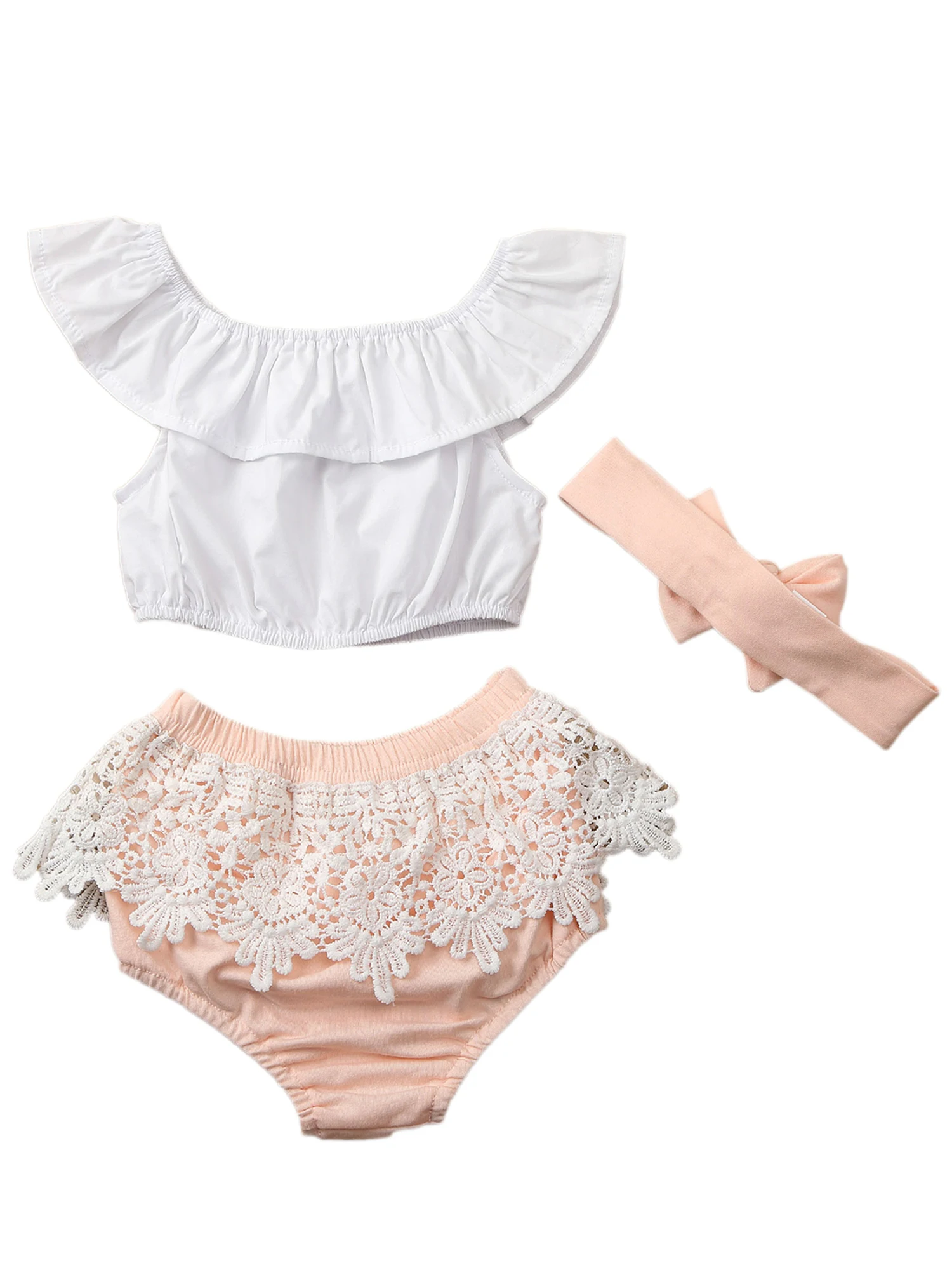 Летние комплекты одежды для новорожденных девочек 0-18 мес., шорты с открытыми плечами, футболка, топ, кружевные штаны, повязка на голову