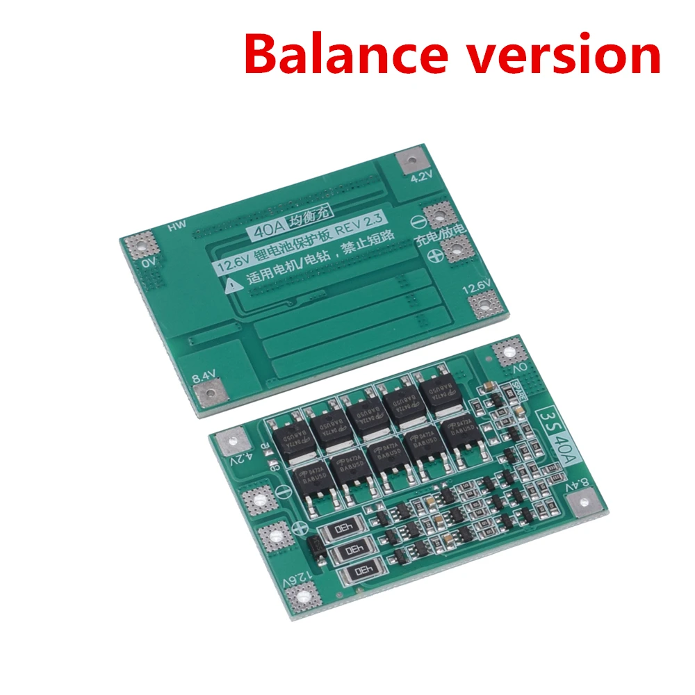 Описание: обратите внимание, что изделие является улучшенной версией. Улучшенная версия: для пускового тока ниже 80A, мощность 135 Вт ниже сверла. (Не сбалансированная функция) 3 S 12,6 в 40 А Защитная плата литиевого аккумулятора область применения: Номинальное напряжение 3,6 В, 3,7 в литиевая батарея (включая 18650,26650, полимерный литиевый аккумулятор) размер изделия: 42*55*3,4 мм (стандартная версия/улучшенная версия), 42*60*3,4 мм (сбалансированная версия) Вес изделия: 8,8 г (стандартная/улучшенная версия), 9,8 г (сбалансированная версия) Напряжение зарядки: ток непрерывной разрядки 12,6-13,6 В (верхний предел): 40 А (если охлаждающая среда не хороша, уменьшите ток нагрузки) ток непрерывной зарядки (Верхний предел): 20A Примечание 1: для успешного запуска сверла требуется три аккумулятора 15C-20C или шесть аккумуляторов 10C-15C (Обычный 18650 не может начать сверло!). Примечание 2: строго в соответствии с картой проводки 0 В, 4,2 в, 8,4 в, 12,6 в, не нарочно короткого замыкания. Примечание 3: при нагрузке щеточный двигатель используется, попробуйте подключиться к неполярный конденсатор с алюминиевой крышкой (выдерживаемое напряжение выше, алюминиевая крышка, 25В, объем 10 мкФ-100 мкФ) к положительным и отрицательным клеммам двигателя, чтобы предотвратить обратный шип от двигателя. Сломайте трубку MOS. Примечание 4: 3 группы аккумуляторов серии, пожалуйста, убедитесь, что напряжение каждой группы батарей, если не одинаковое, пожалуйста, заполните каждый аккумулятор отдельно, а затем используйте в серии. Тест разряда, падение напряжения быстрее батареи, что Группа плохой батареи. Для некоторых из плохой базы электронных клиентов, чтобы пояснить: сбалансированный заряд-это только вспомогательные функции, старайтесь не класть хороший аккумулятор и плохой аккумулятор, смешанный вместе! 3 комплекта емкости аккумулятора/сопротивления ближе к лучшему! (2 хорошие батареи + 1 плохой эффект использования батареи = 3 плохой эффект использования батареи).
