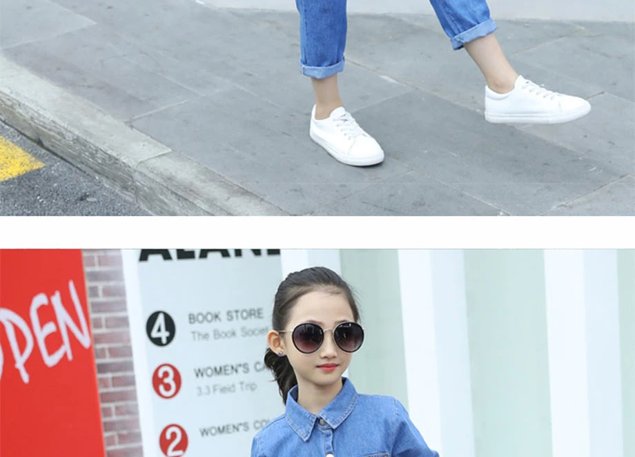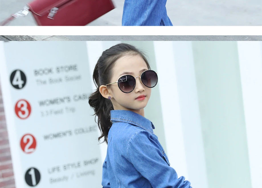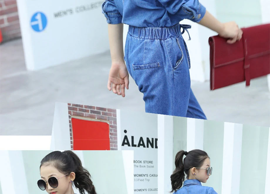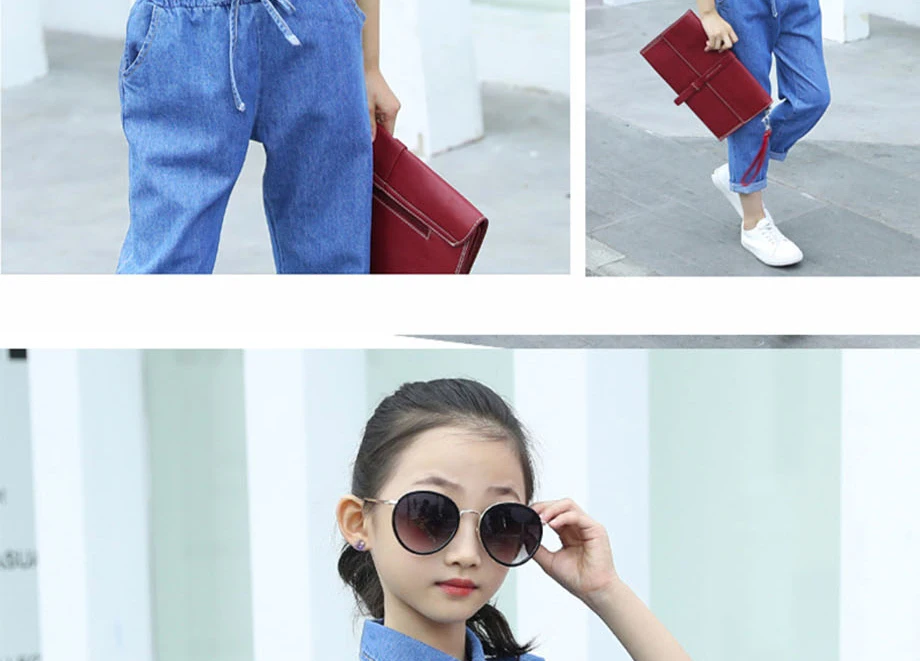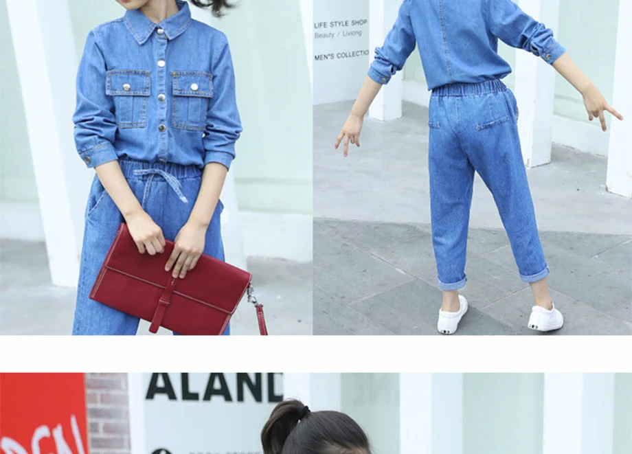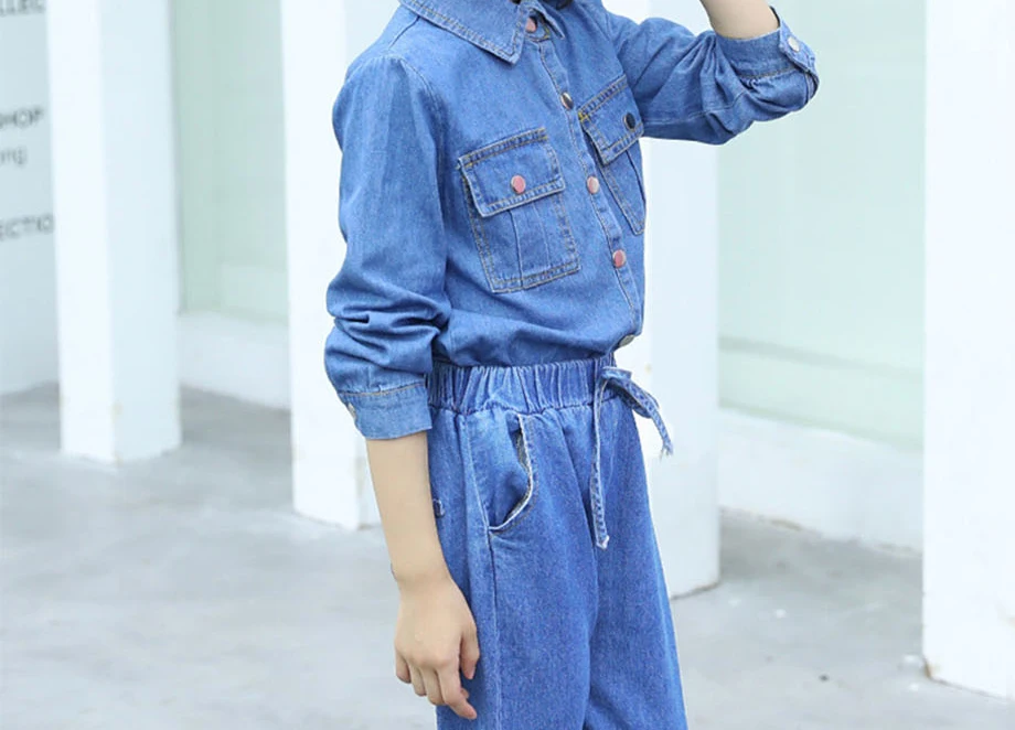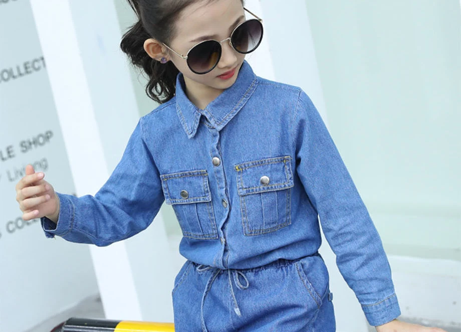 Повседневная одежда для девочек, осенние и весенние синие топы из денима, длинные брюки, женская одежда, 4, 5, 6, 7, 8, 9, 10, 12 лет