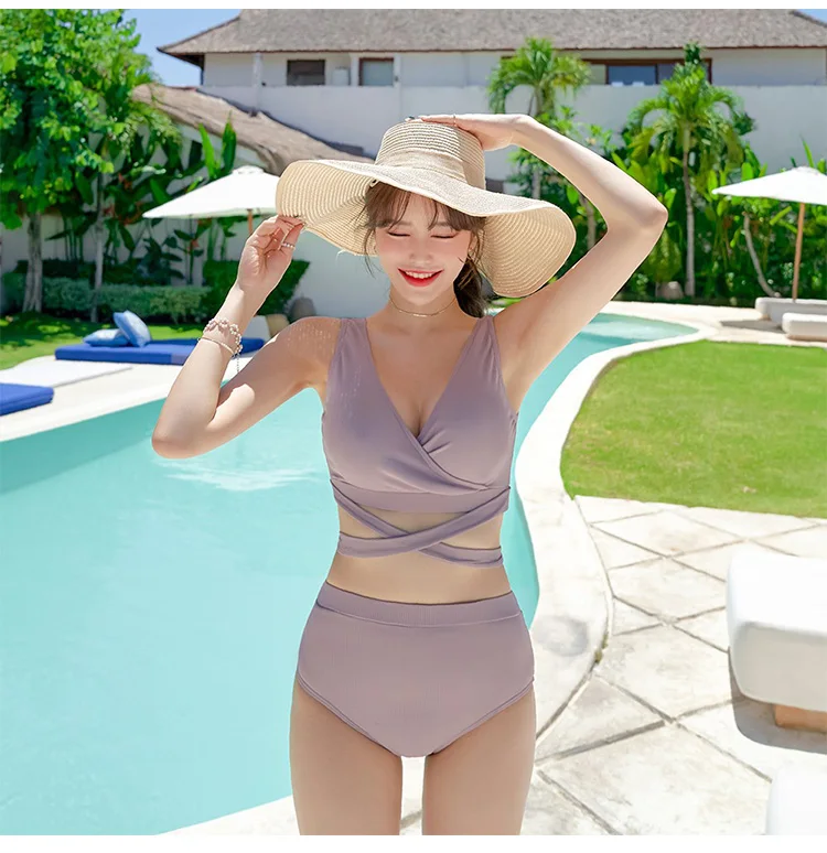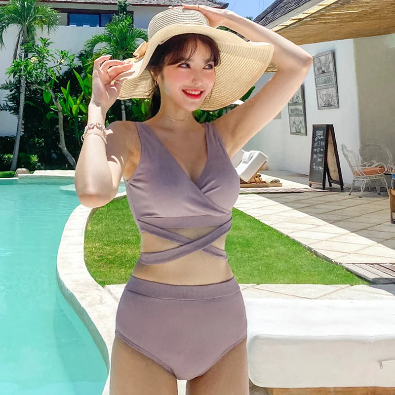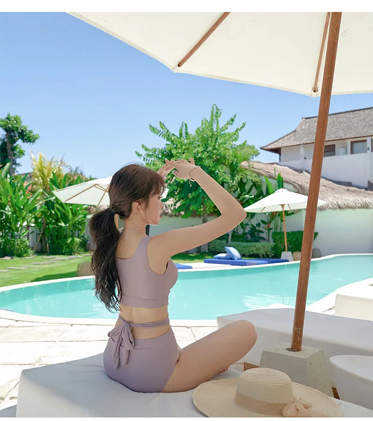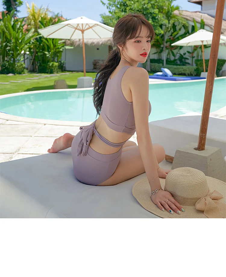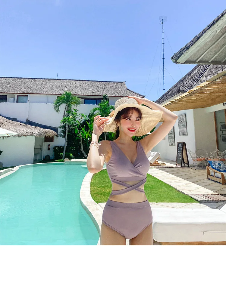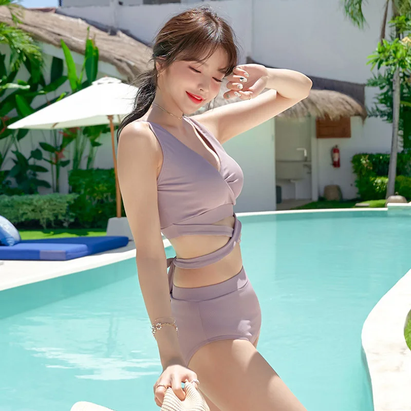 Женский однотонный купальник с высокой талией и поясом