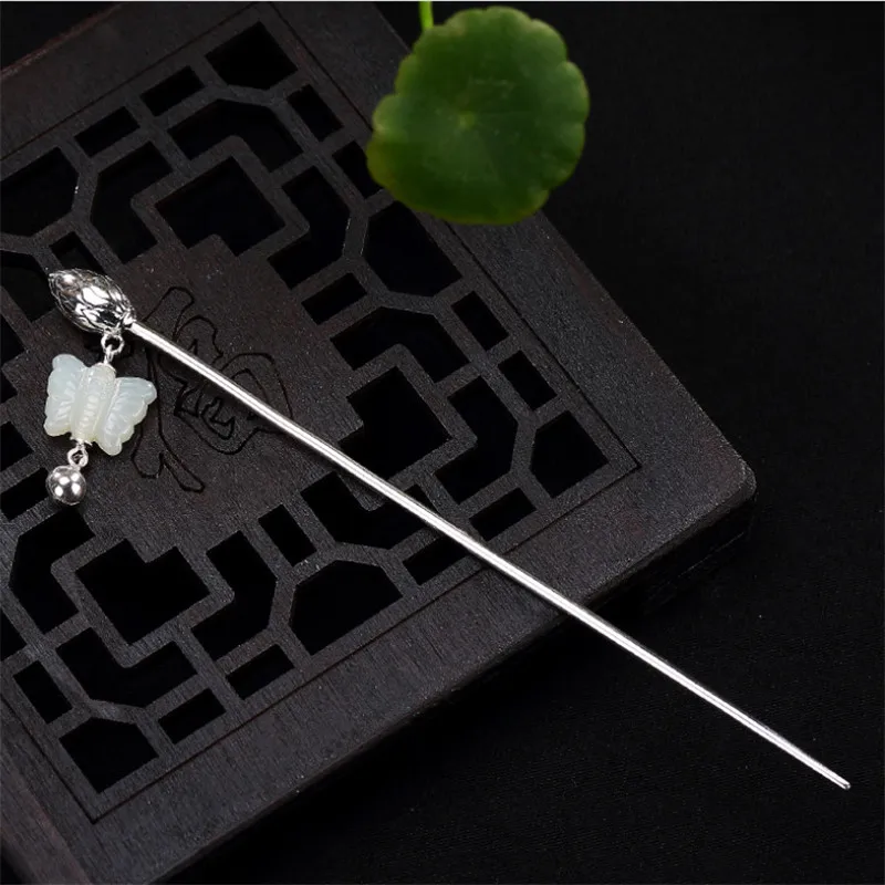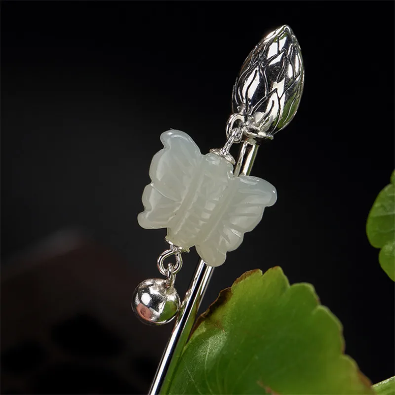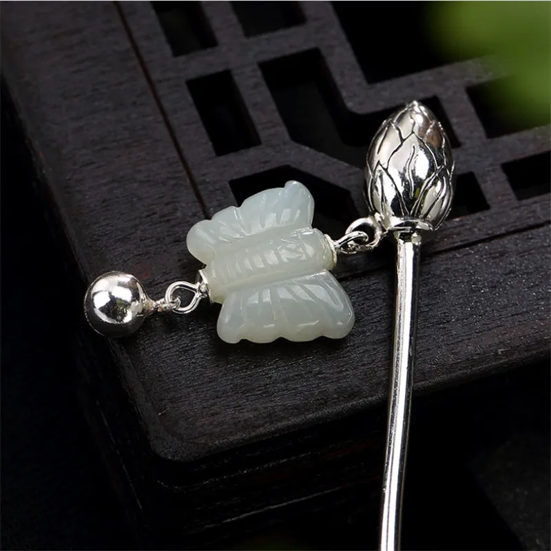 Uglyless этнические тайские серебряные бутоны лотоса украшения для волос для женщин натуральные нефритовые бабочки палочки для волос 925 Серебряные вилки украшение для волос