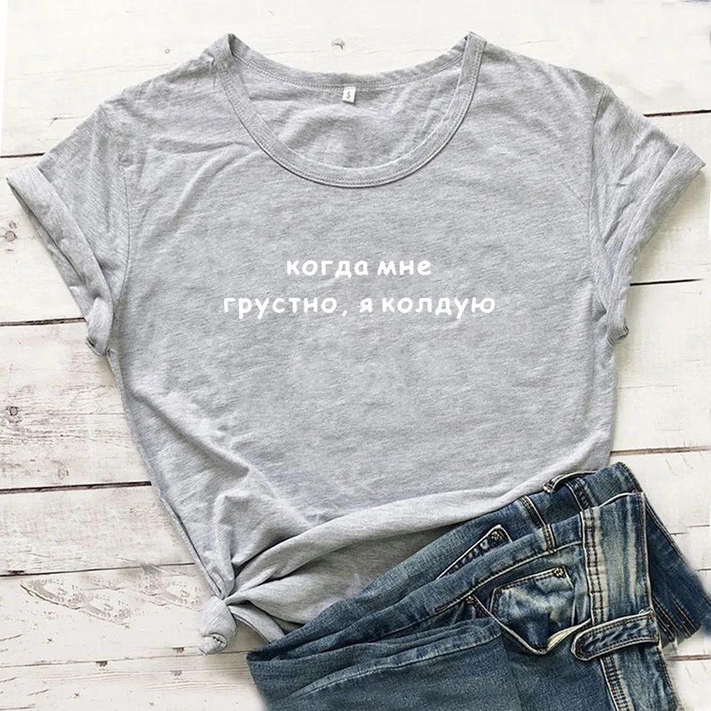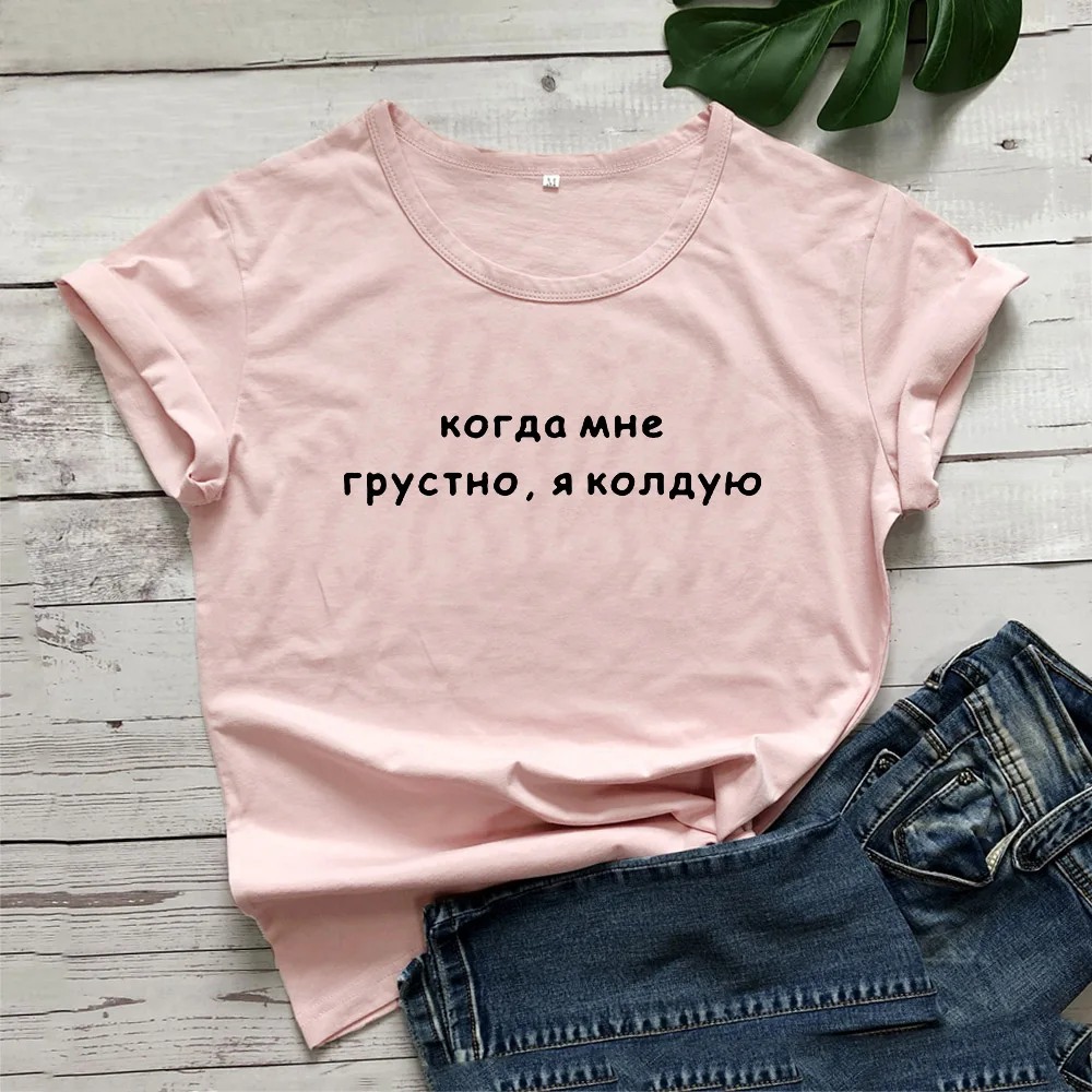 Футболка женская в стиле Харадзюку, рубашка свободного покроя с изображением русского, когда мне грустно, хлопковая футболка с коротким рукавом