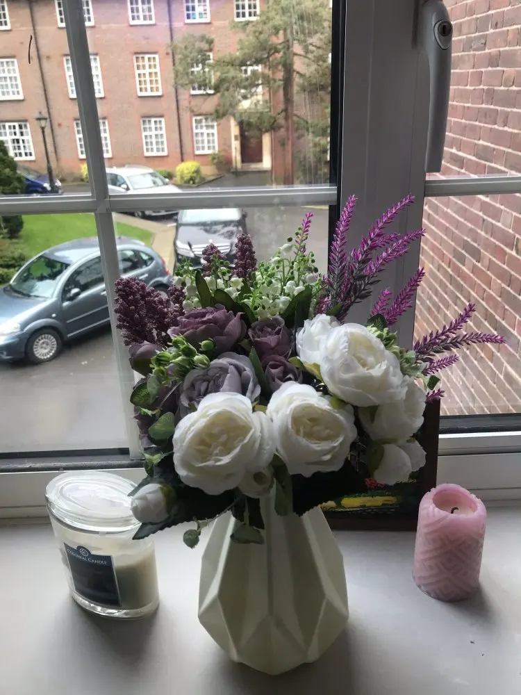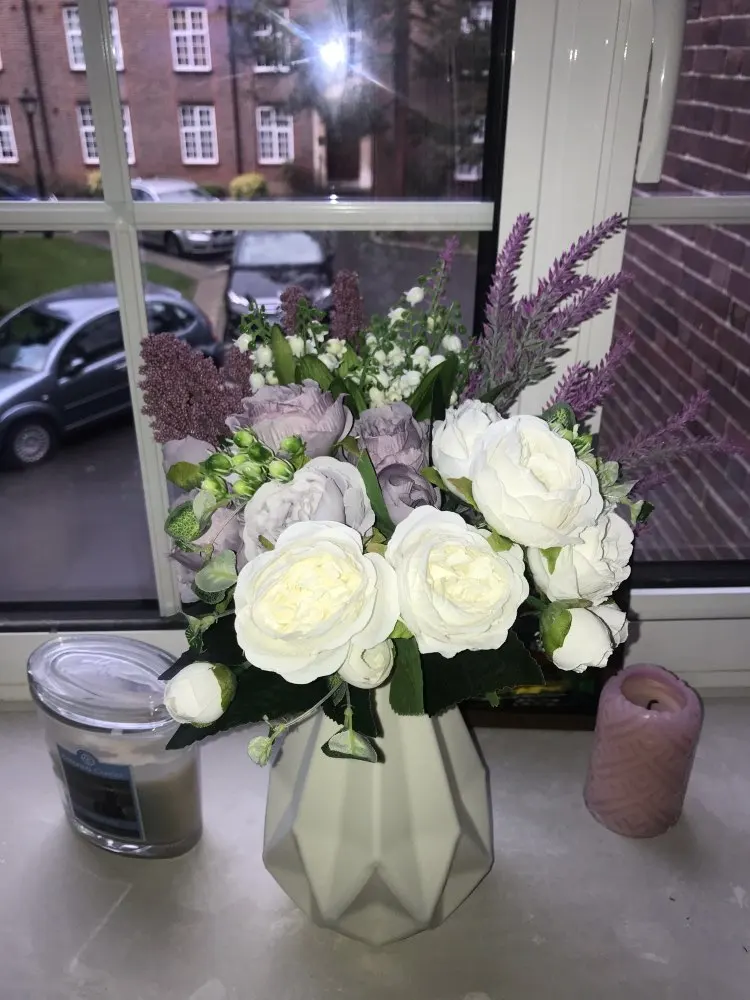 Очень красивый букет. Советую покупать сразу 2-тогда будет вообще превосходно. Очень хорошее каество.Похоже на реальные цветы. Поставлю себе в спальню на тумбочку.