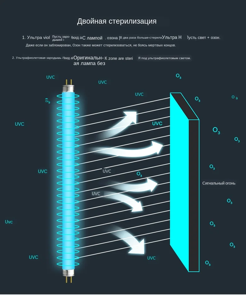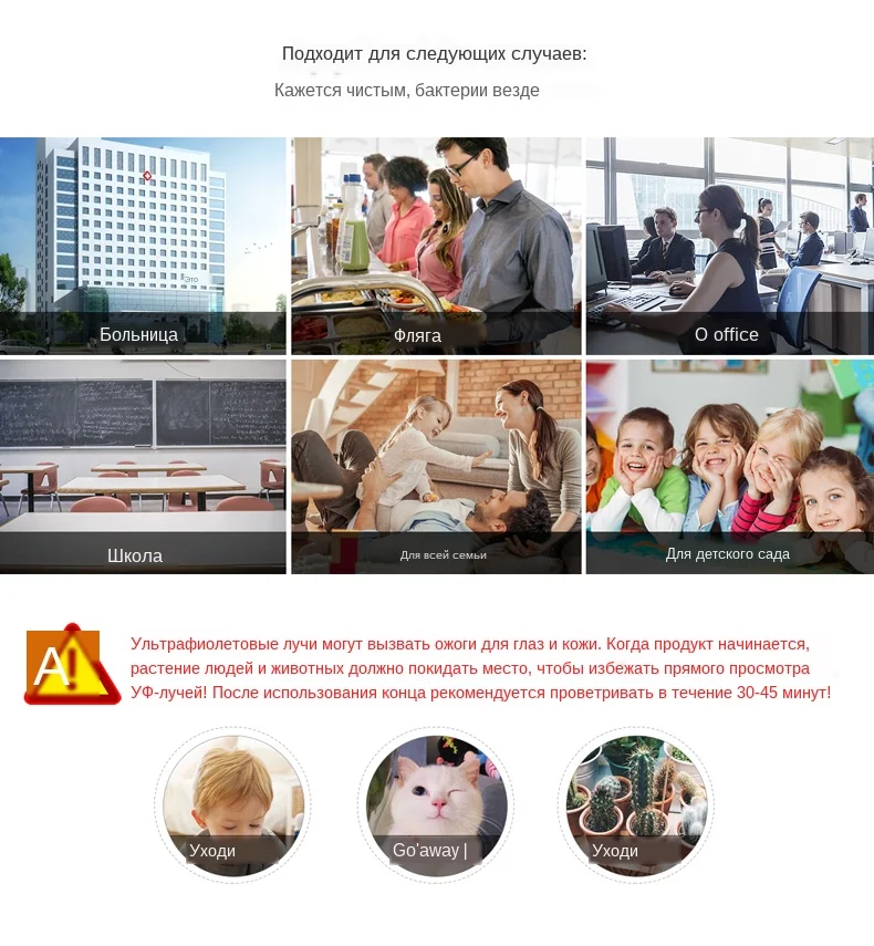 UVC Ray вреден для глаз и кожи, не смотрите на лампу, когда светильник поднимается. Люди/питомцы/растения не могут подвергать светильник. После использования, потому что лампа убивала много бактерий в комнате, пожалуйста, откройте окна и двери, позвольте комнате проветривать 15 минут, а затем войти.