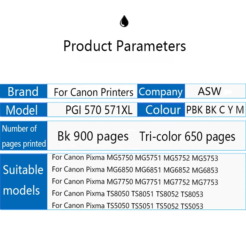 Для следующих струйных принтеров Canon PixmaPixma MG5750 MG5751 MG5752 MG5753Pixma MG6850 MG6851 MG6852 MG6853Pixma MG7750 MG7751 MG7752 MG7753Pixma TS8050 TS8051 TS8052 TS8053Pixma TS5050 TS5051 TS5052 TS5053Pixma TS6050 TS6051 TS6052 TS6053Pixma MG6800 MG5700 TS5055 TS9050 TS9055