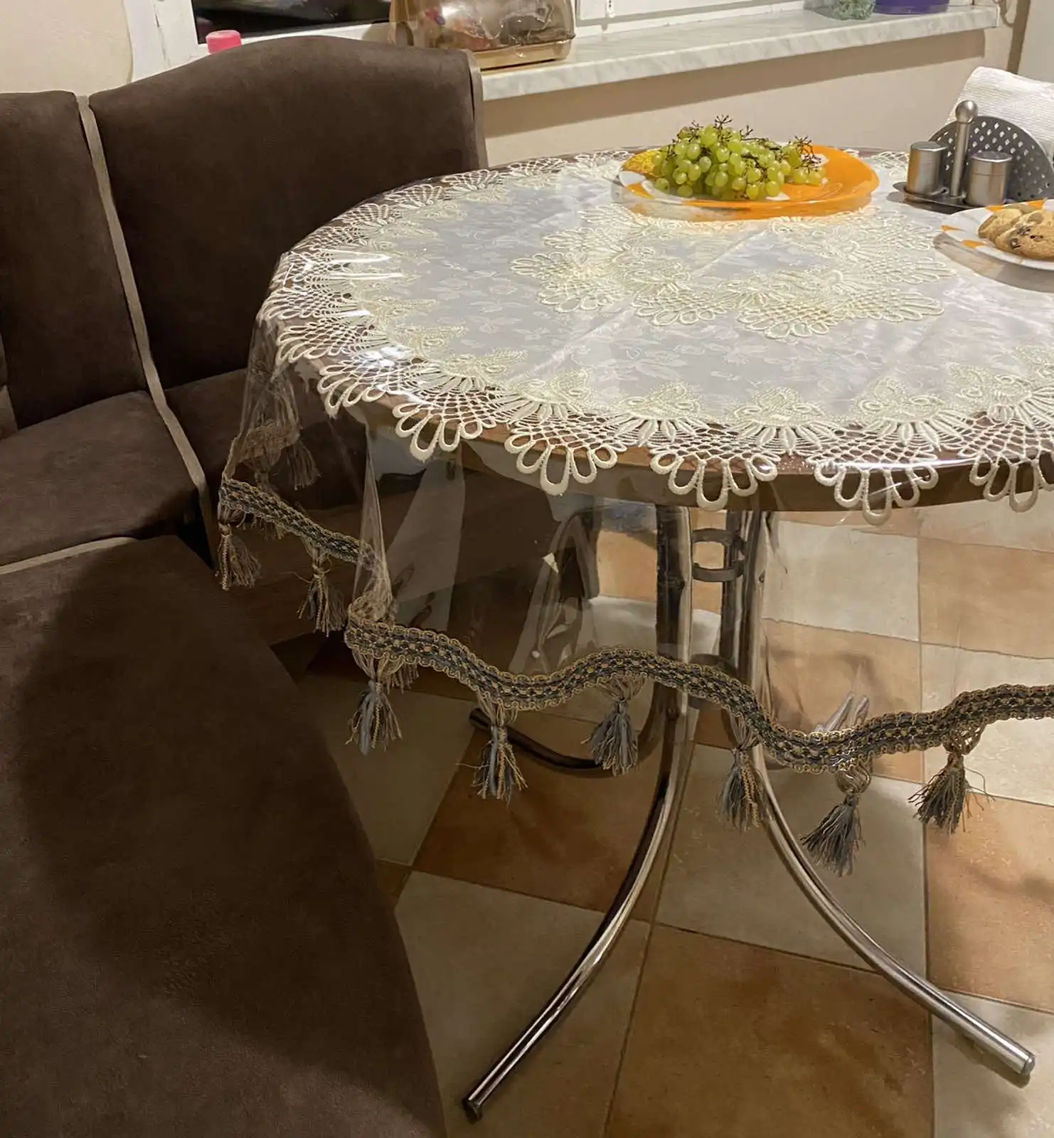 пятерка за то что доставка быстрая но я не была осторожно и не купила правильный размер. на стол диаметром 110 см это скатерть идёт прямо до краев