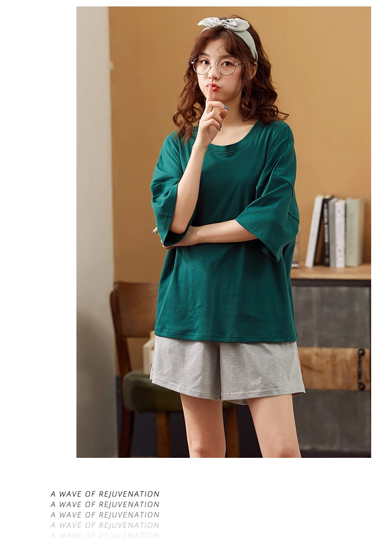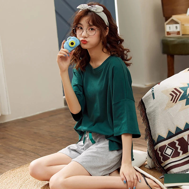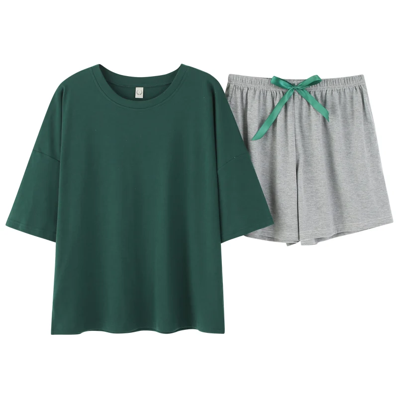 Пижама женская хлопковая, однотонная, с коротким рукавом и круглым вырезом