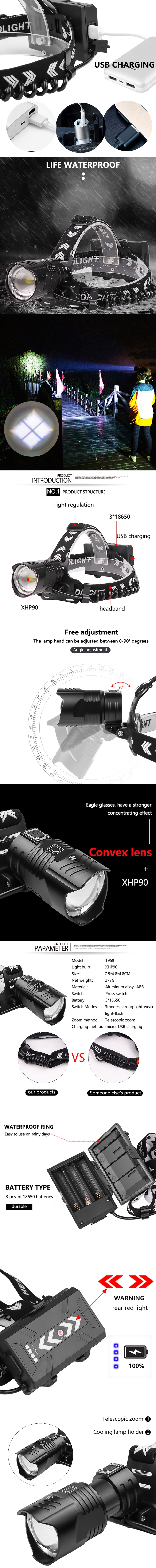 Супер яркий светодиодный налобный фонарь Xhp90.2, налобный фонарь, лампы-фонарики с увеличениемотключением, литиево-ионный аккумулятор 3*18650