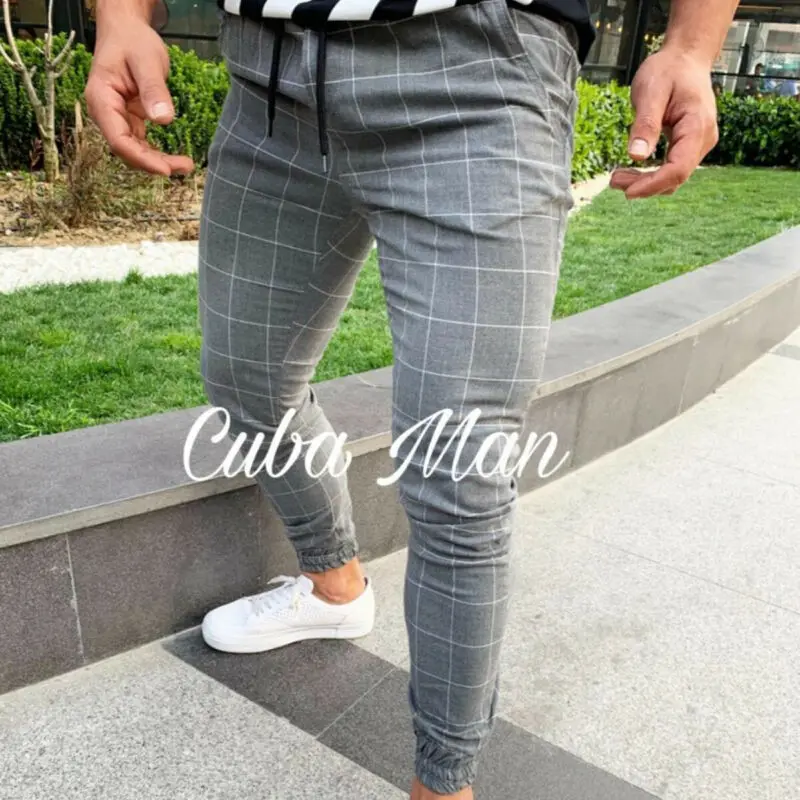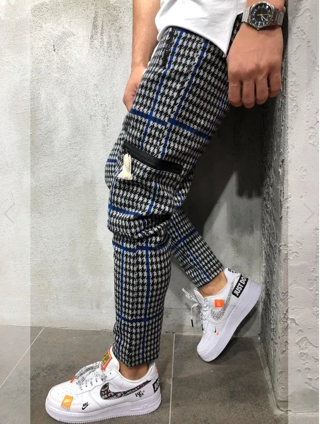 Брюки мужские с высокой талией, пикантные модные облегающие клетчат...