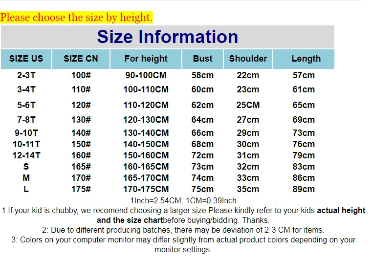 1. Если ваш ребенок крупный, мы рекомендуем выбрать больший размер. Пожалуйста, обратитесь к вашим детямФактическиеВысота и Таблица размеровПеред покупкой/торгами. Спасибо за понимание.