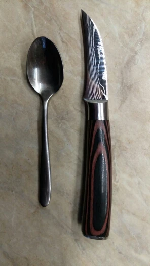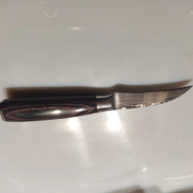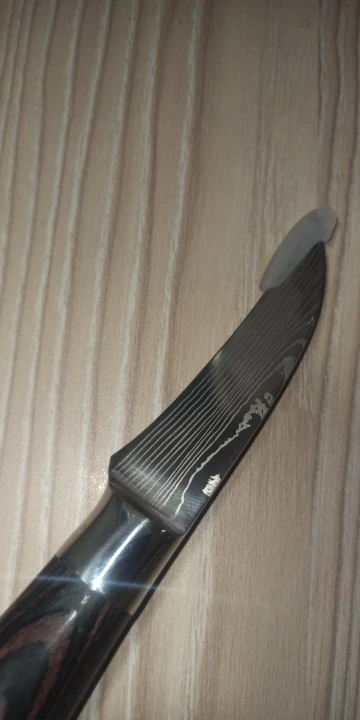 Очень хороший нож tourne. Нож довольно острый из коробки. Немного на более тяжелой стороне. Я не уверен, что узор в Дамаске является реальным или применяется лазером. Доставка занимает около 2 месяцев В целом Нож выглядит отлично и может разрезать ....