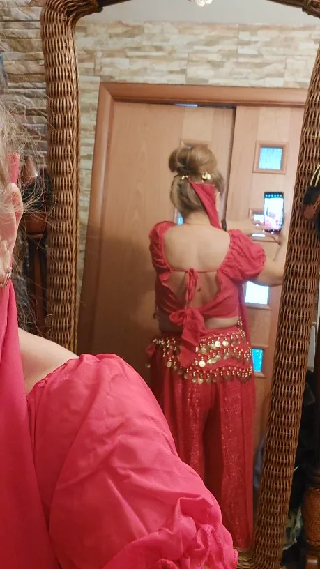 Комплект включает в себя: 1 Топ, 1 шаровары, 1 шарф на бедрах, 1 шарф на голову