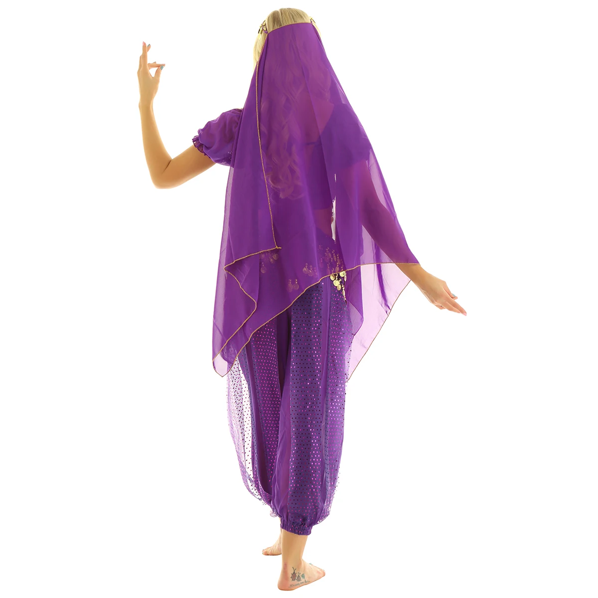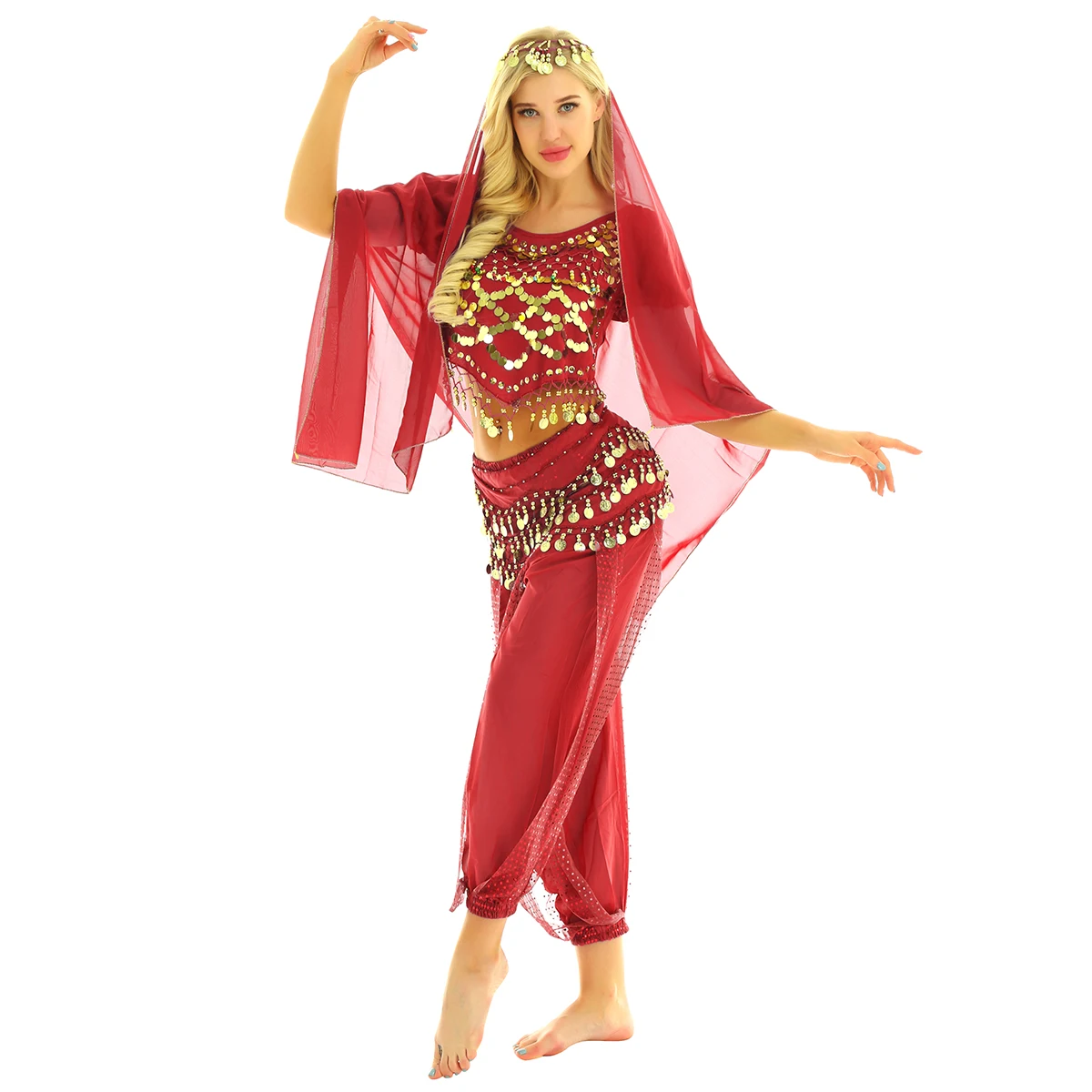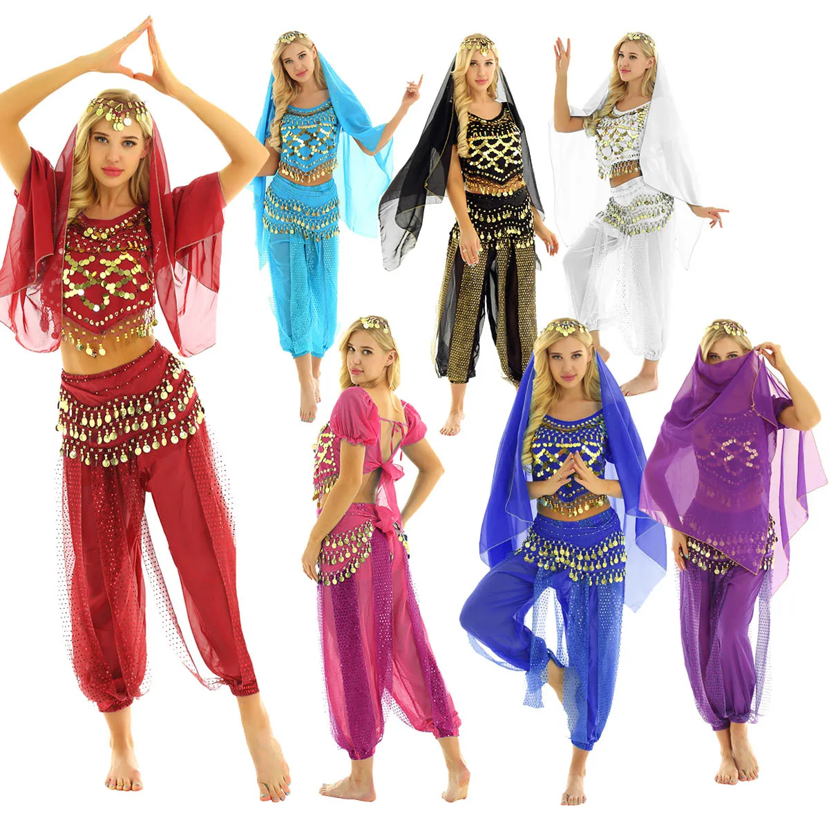 Женский костюм для танца живота на Хэллоуин, карнавальный костюм для индийского танца, комплект одежды, мягкая и охлаждающая шифоновая ткань для удобной носки, один размер подходит для большинства.