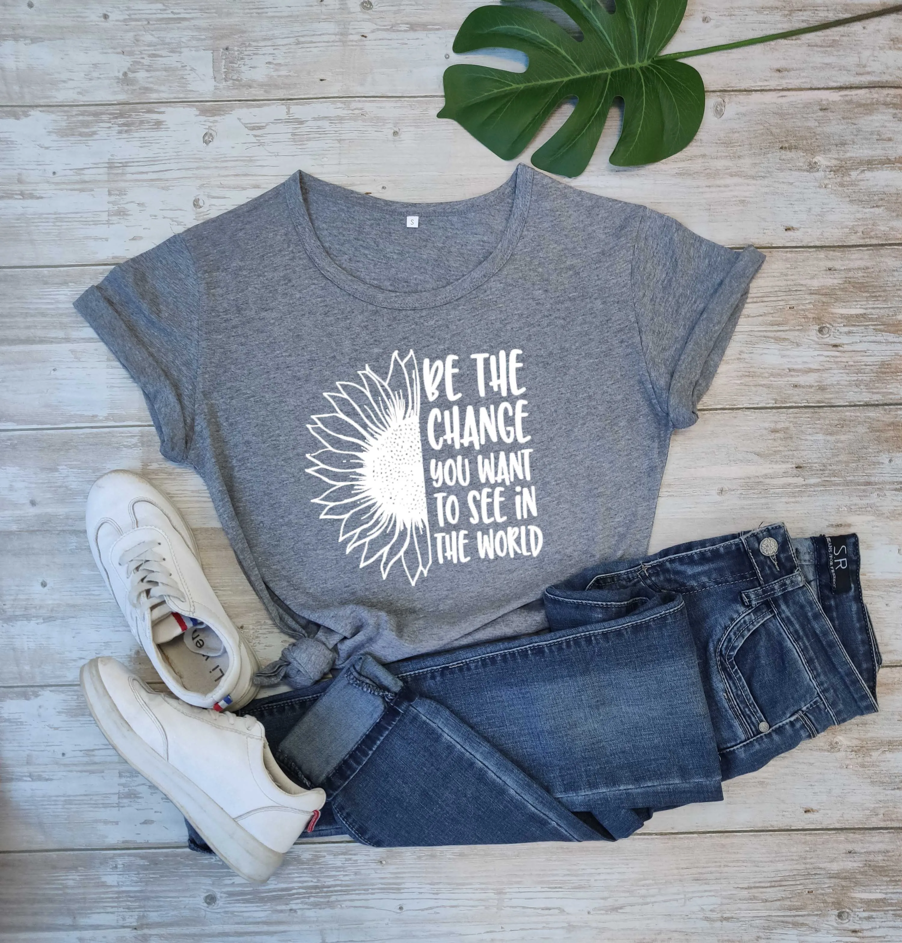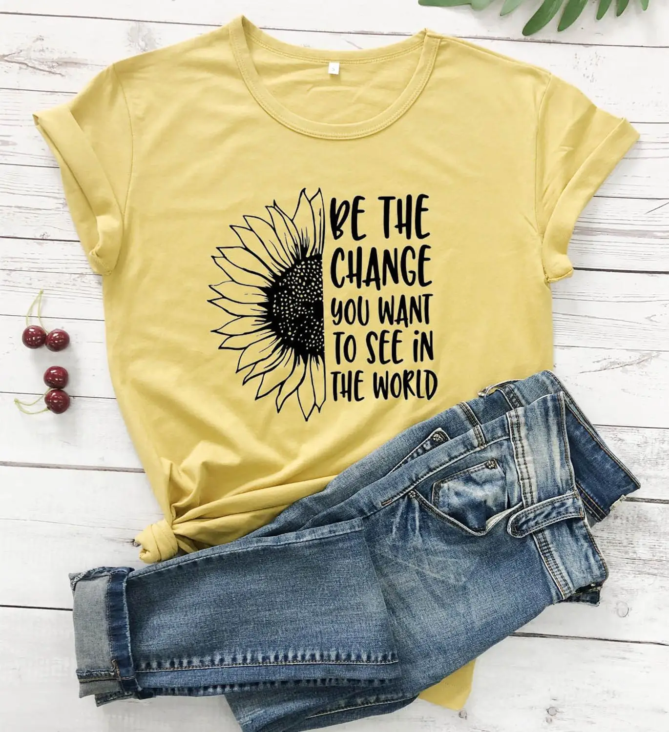Женская футболка из чистого хлопка, с надписью Be the change you want to see in the world