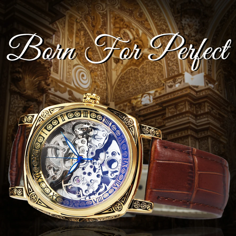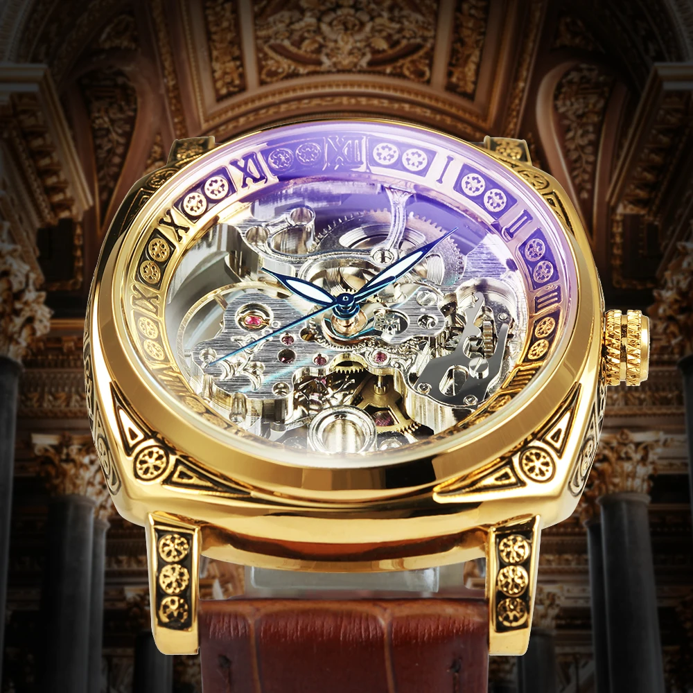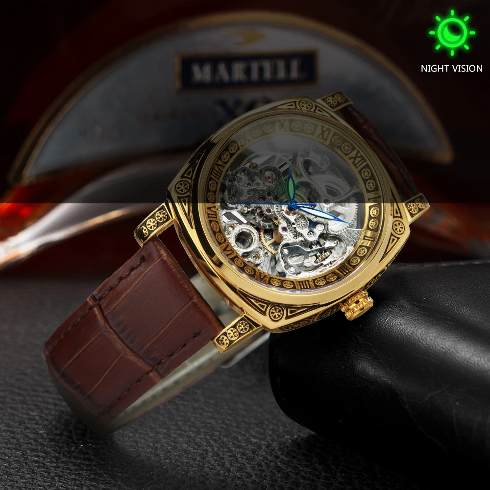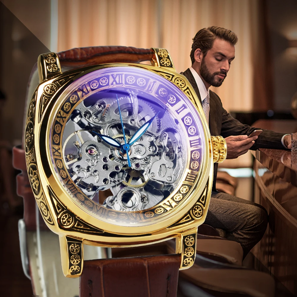 Часы-скелетоны Мужские автоматические механические, люксовые прозрачные квадратные светящиеся указки, резные движущиеся, с кожаным ремешком