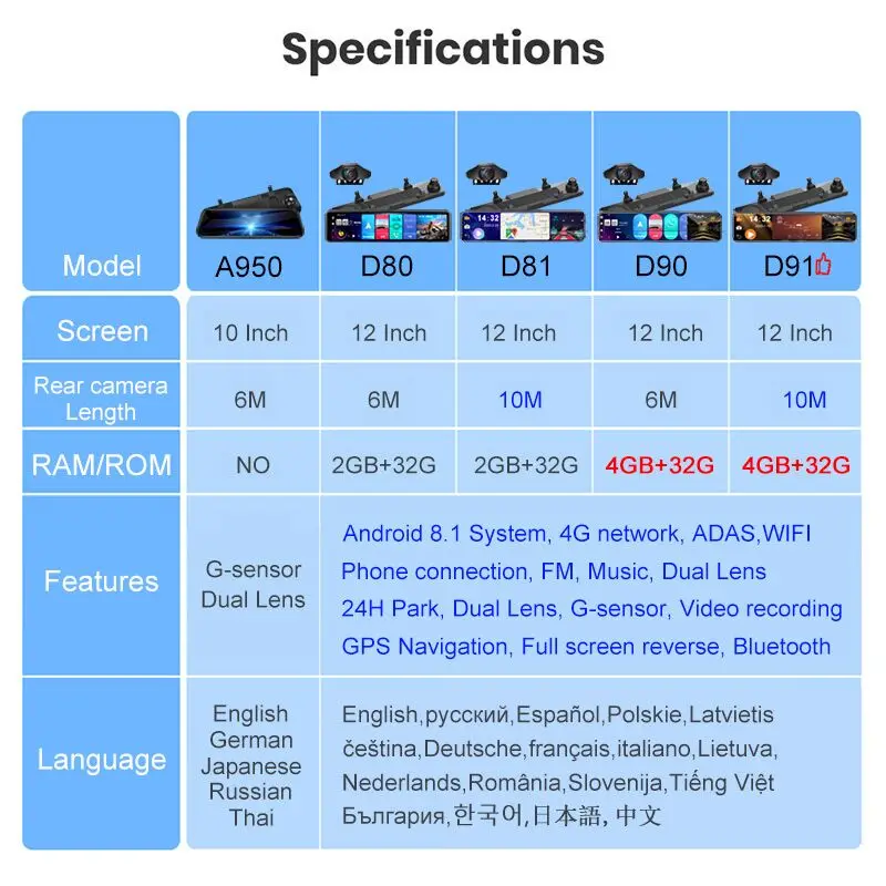 3. A950-это 10-дюймовое потоковое медиа-зеркало без функции Android. Пожалуйста, внимательно проверьте разницу в каждом варианте перед покупкой.