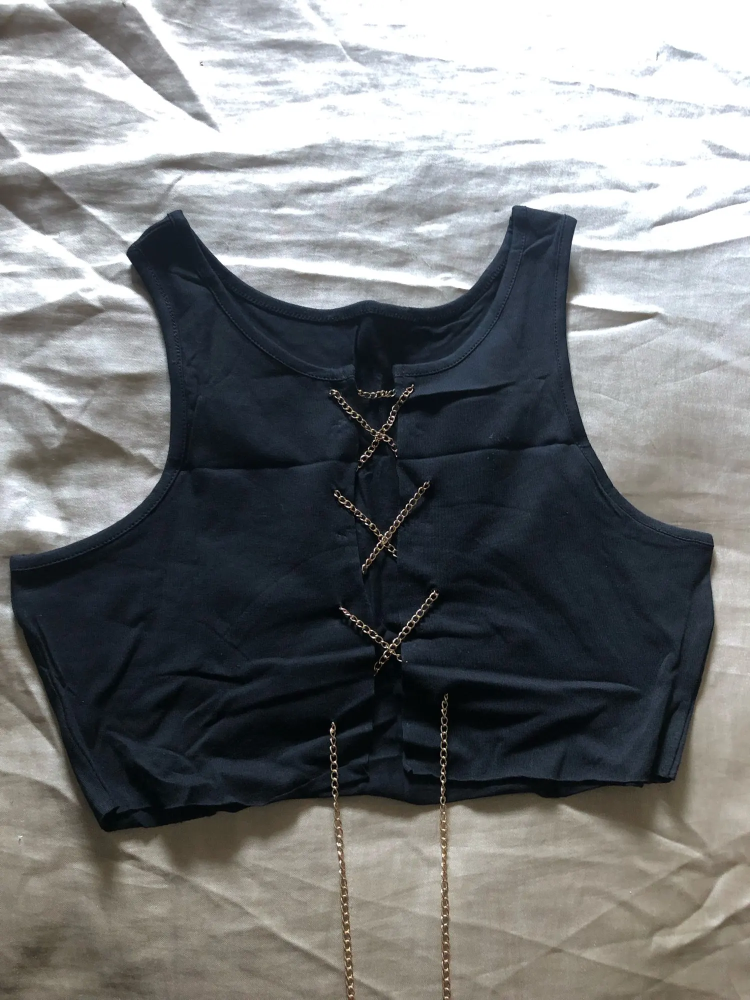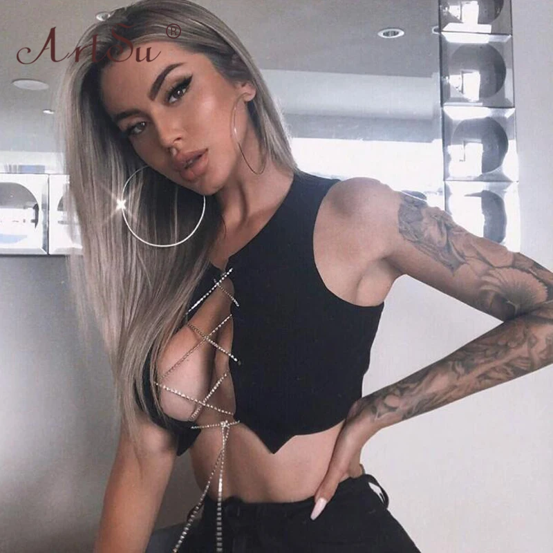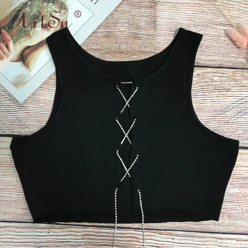 Серебро Золото Кристалл АлмазЖенский укороченный топ на шнуровке с металлической цепочкой, Женская Клубная одежда, майка с вырезами, летние белые, черные, красные Топы