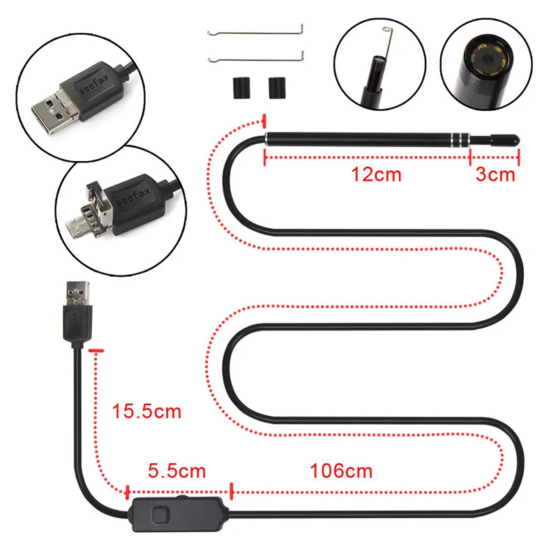 С помощью электронной микро-камеры вы можете в режиме реального времени наблюдать весь процесс выкапывания ушного воска через usb-кабель для передачи данных.