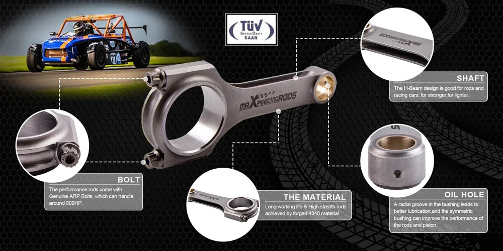 Поршень болт отверстие: +/-4/1000 ммМощность: 600hp ~ 800hp в набореПрочность крепления (PSI): 220,000/230,000 PSIКрутящий момент: 48ft ≈ 65 нмМаксимальная скорость: 9000 об/минКоличество: 6 штук в комплектеБолты: Включая настоящие 3/8 "ARP 2000 болты (Примечание: дополнительные расходы на обновление до ARP L19 болты)Материал: Кованая 4340 летательная Хромовая молистая качественная сталь для гонокДопуск по весу: сбалансированный до +/- 1 г в комплекте