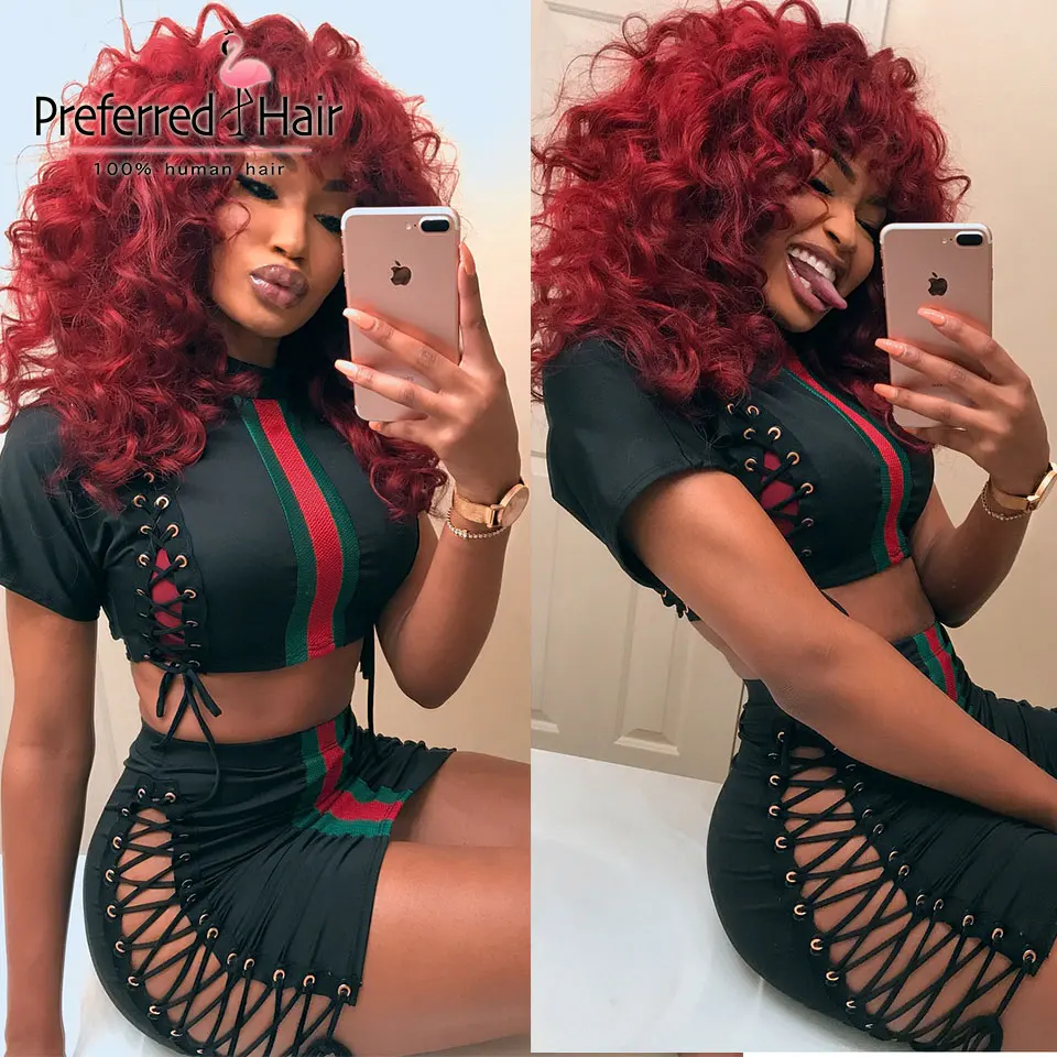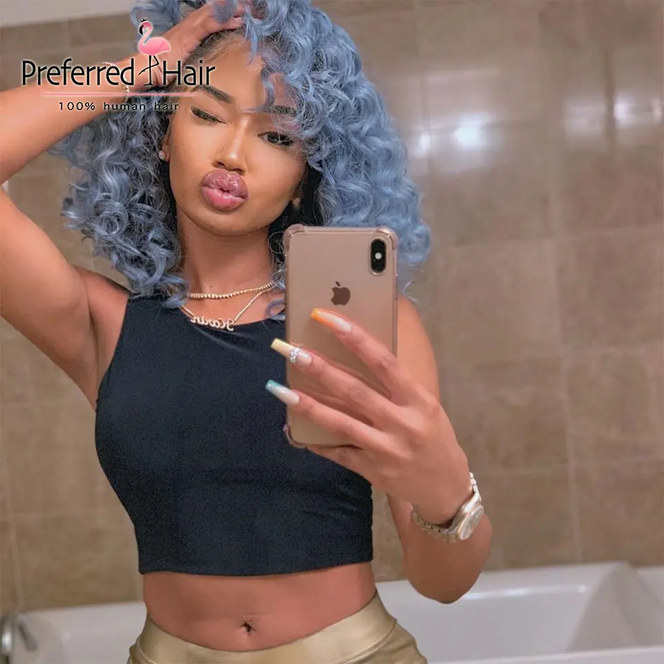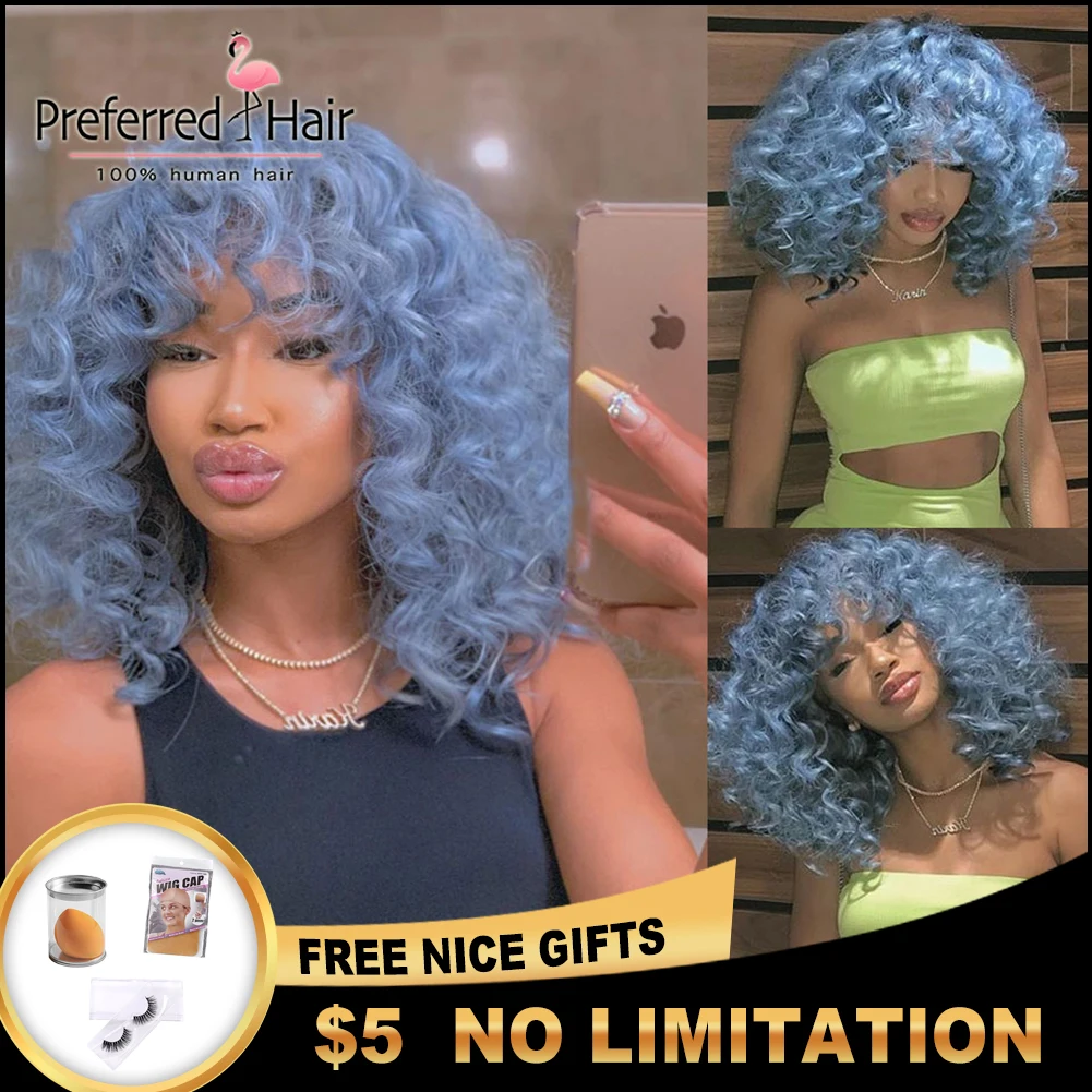 Предпочтительная полная челка 180% синий кудрявый парик из натуральных волос предварительно выщипанная красная сетка