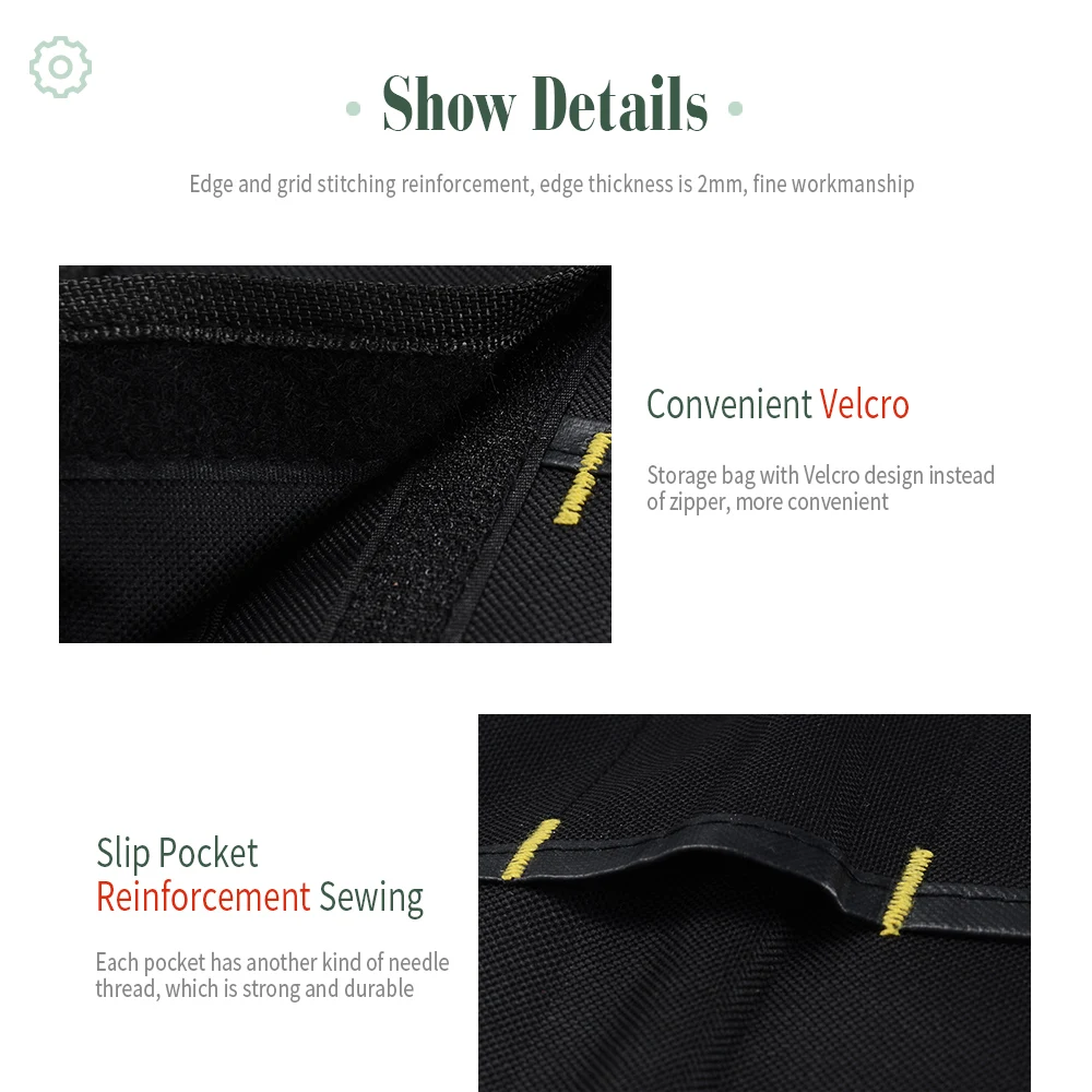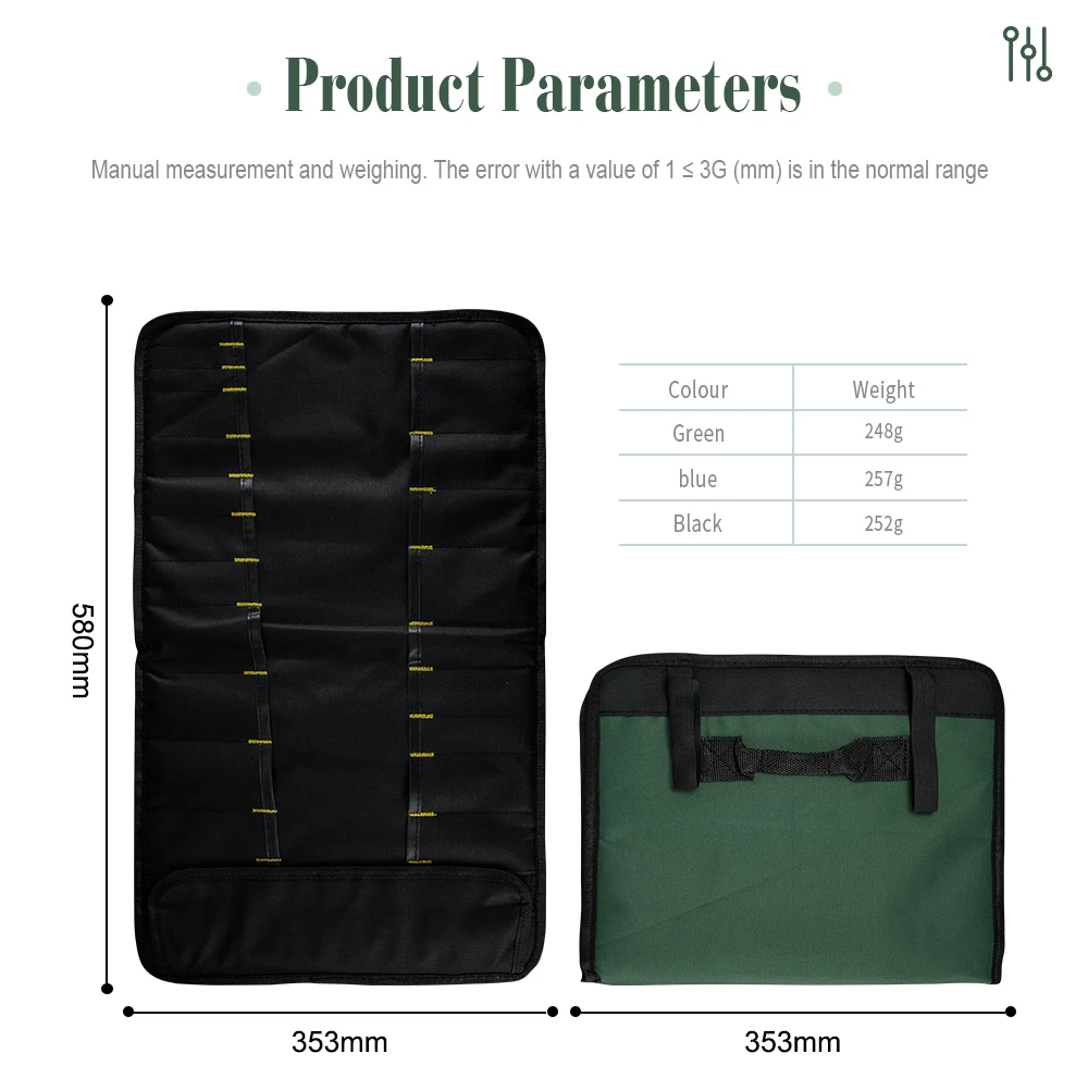 -Вы можете выбрать 3 цвета. -Материал ткани Оксфорд, прочный, не легко гнить. -Различные размеры карманов доступны для различных видов ножей. -Вы можете положить ножи в один профессиональный карман шеф-повара.