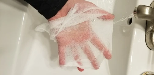 После разархивирования получается тряпочка-марля вытереть лицо, руки. Запаха нет, штука полезная.