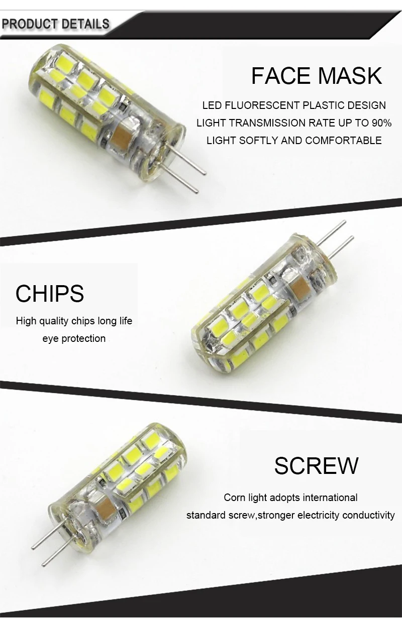 Длина: 54 мм-61 мм Напряжение: DC12V/AC 220V Светодиодный Кол-во: 24/48/64/96/104/152 шт Диаметр: 16 мм Тип разъема: G4 / G9 Угол освещения: 360 Поверхность: силикагель Светодиодный чип-Модель: SMD 3014 или SMD 2835 Цвет: теплый белый/холодный белый Цветовая температура: теплый белый 2800-3200K, холодный белый 6000-6500K Размер: 54 мм-61 мм * 16 мм (длина * диаметр) > Применение: В помещении, коридорах, офисах, ресторанах, кухнях и других помещениях > Место происхождения: Гуандун, Китай (материк)