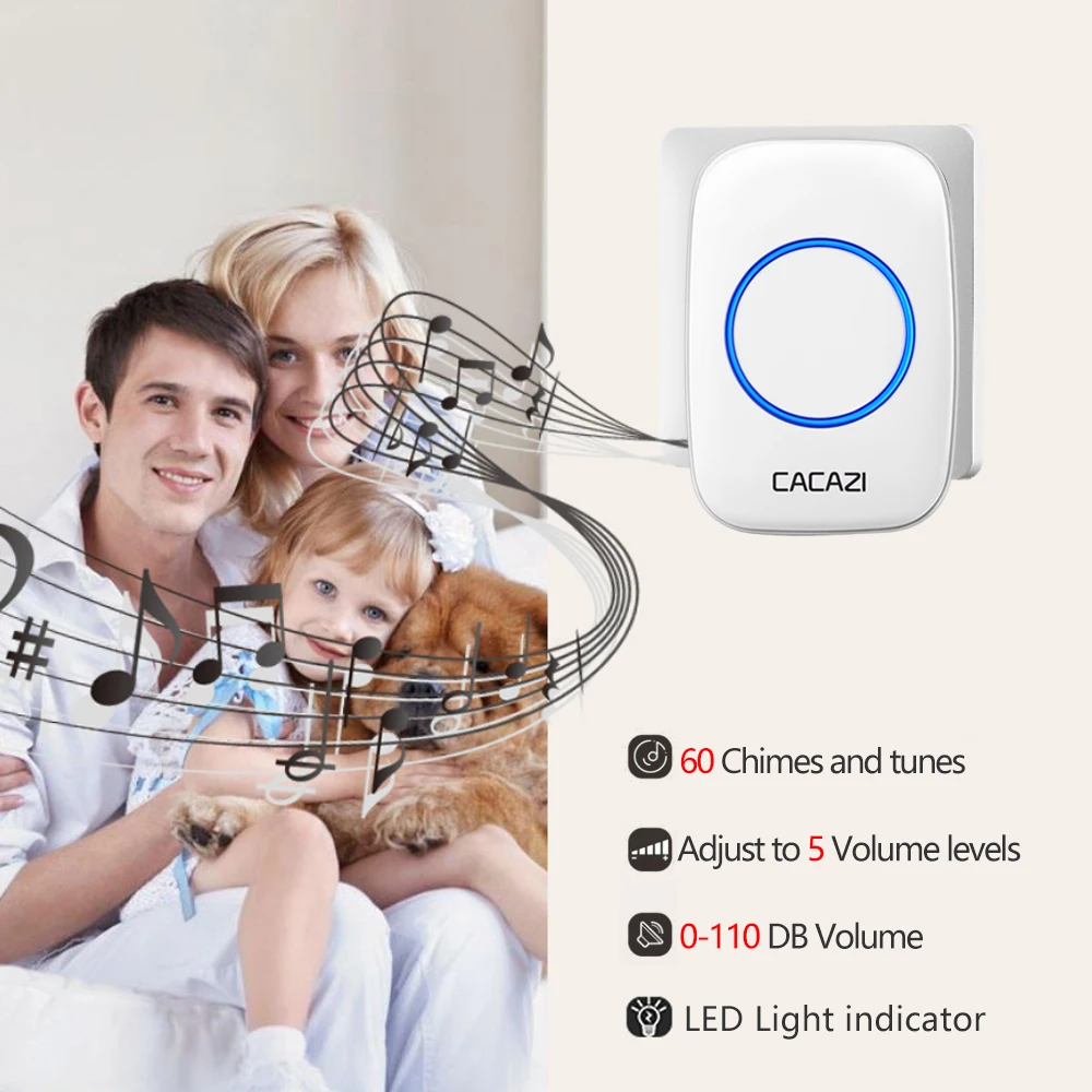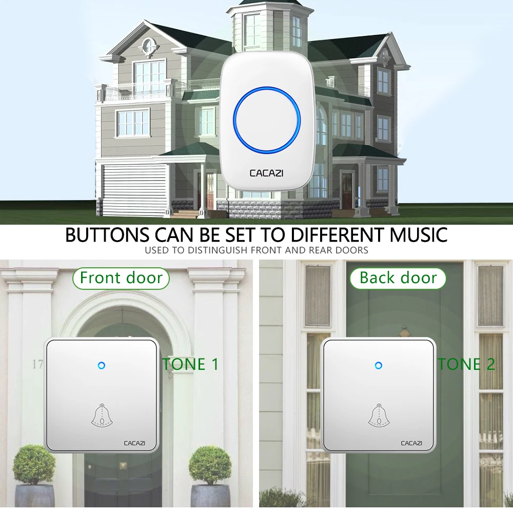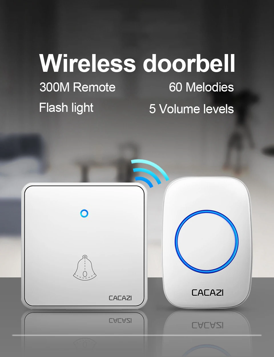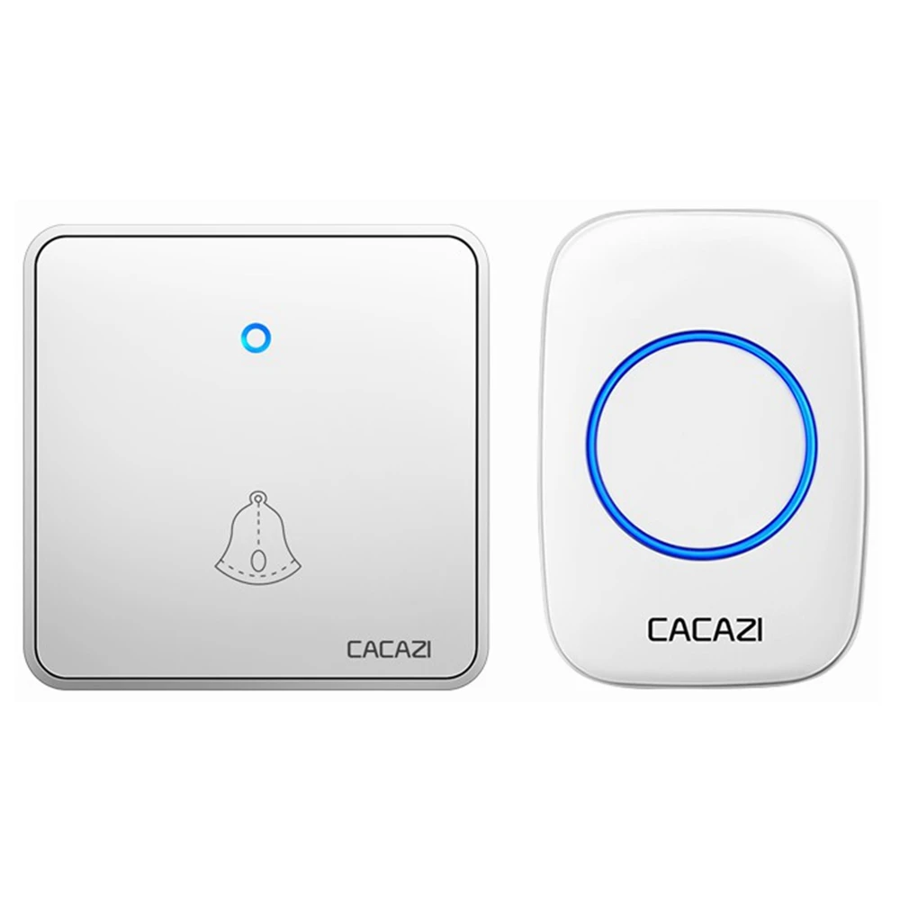 Беспроводной дверной звонок CACAZI, водонепроницаемый, с дальностью действия 300 м, 60 звонков CR2032, батарейный передатчик, приемник светильник щения, вилка стандарта США, ЕС, Великобритании
