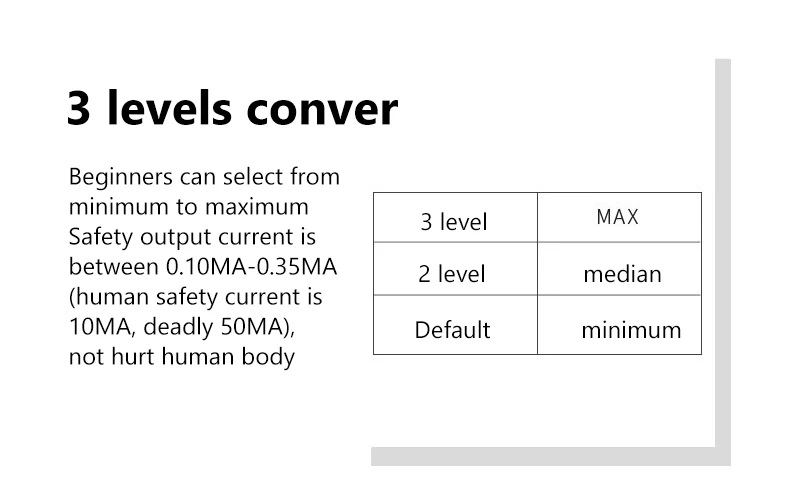 -3 уровня тока электроэнергии. Новички могут адаптироваться к минимальному току, топ-пользователи могут adjsut до максимального уровня;