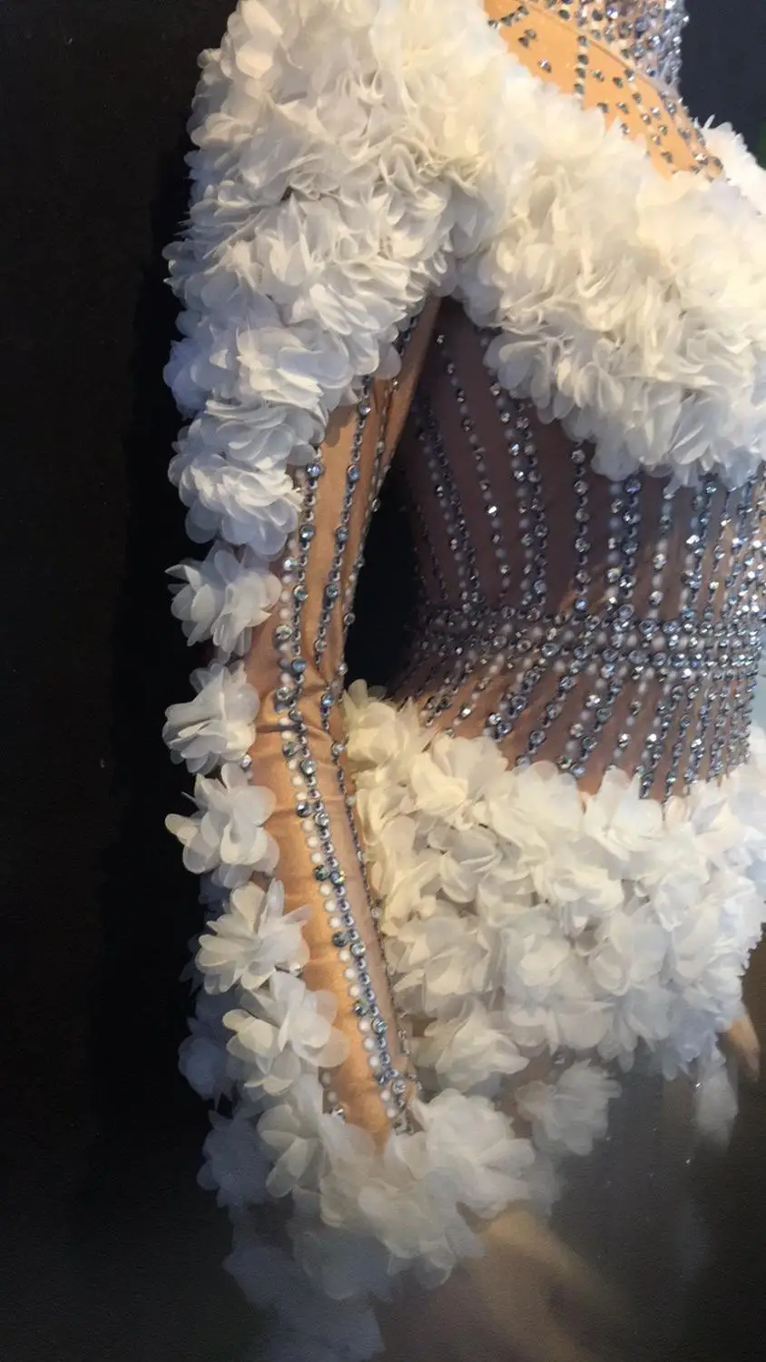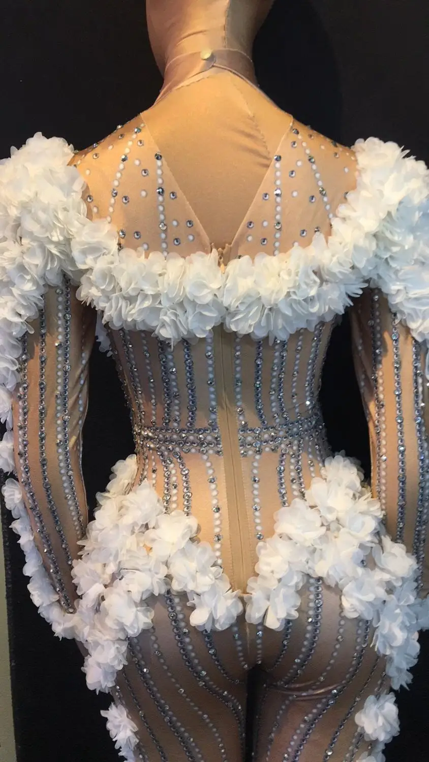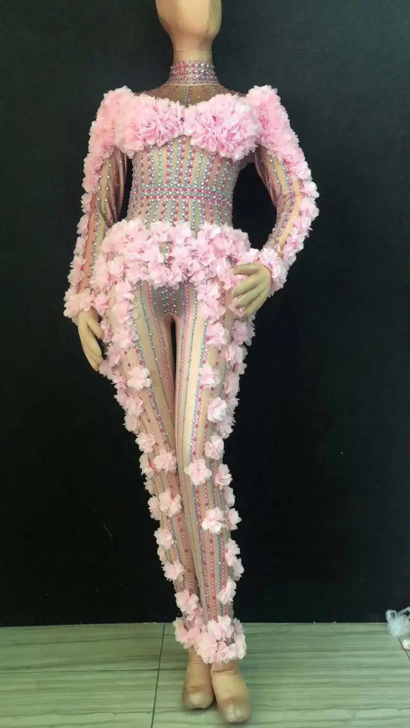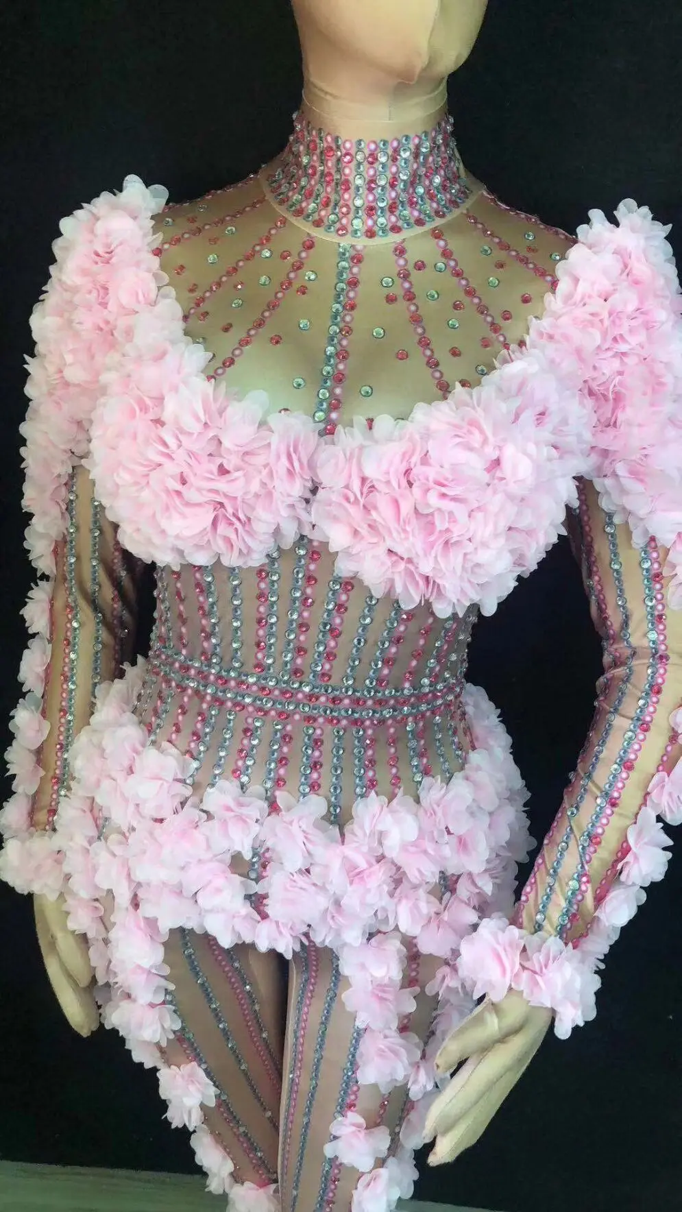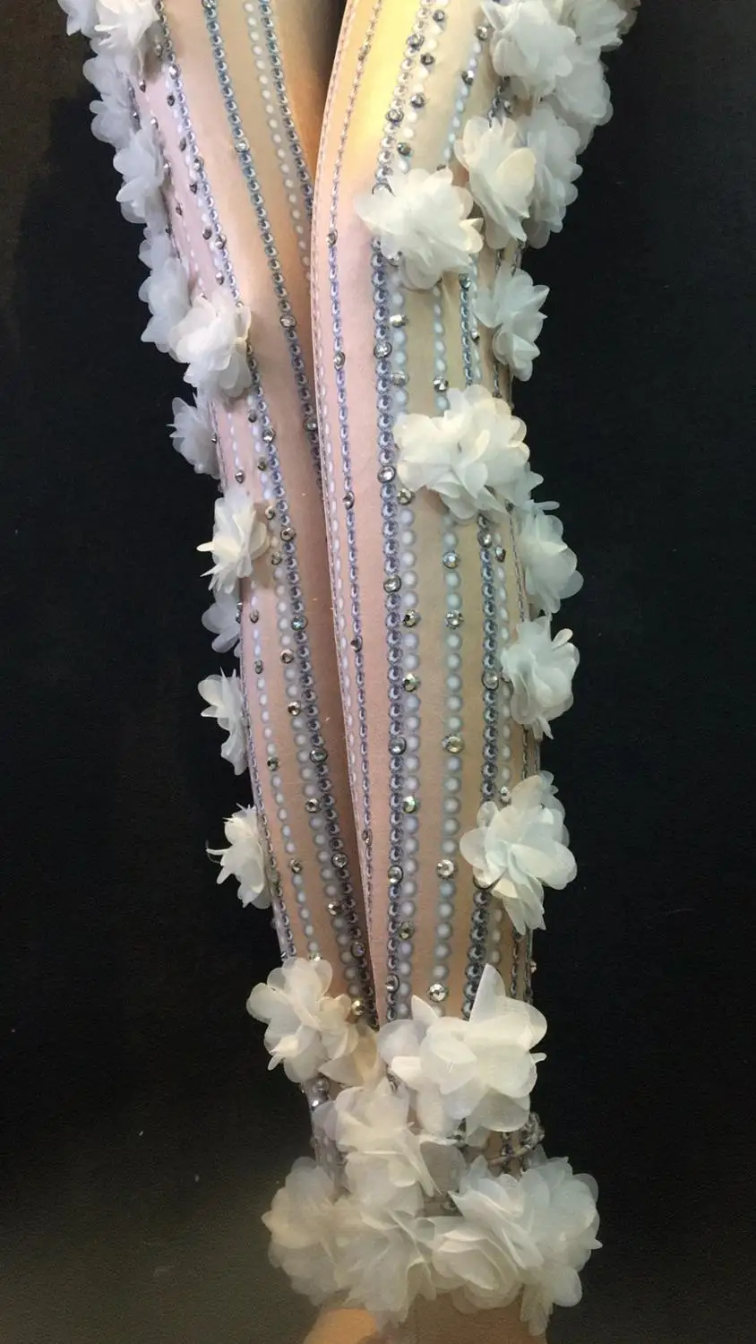 Женский костюм певицы для ночного клуба, сценический костюм с розовыми белыми цветами и кристаллами, комбинезон для празднования дня рождения, выпускного вечера, Вечерние боди для выступлений