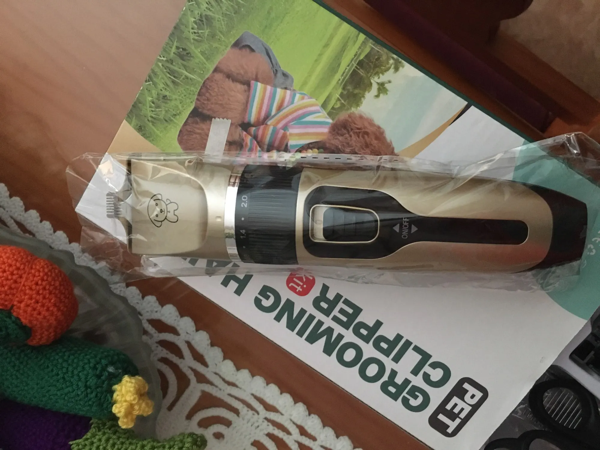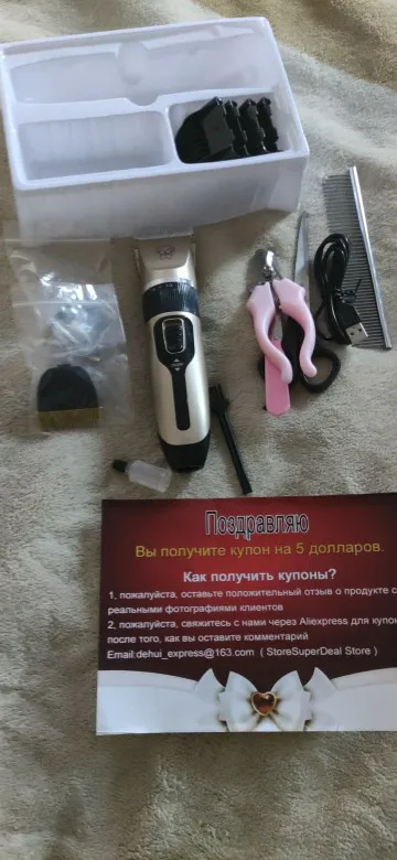Доставка в Астрахань-5дней!Привез курьер домой. Все идеально упаковано. Коробка целая, не мятая. Всё насадки на месте, масло для смазки есть. Машинка пришла заряжена. Сразу же опробовали. Той-пуделя(6лет),заросшая с колтунами собака- подстригли за час с насадкой 3. Приходилось несколько раз снимать насадку и счищать пух застревающий. Стригли насадкой "3"-эффект велюра. Без насадки выбили морду и носочки на лапах. Как пользоваться когтерезом не знаю. Может что напишет, а?