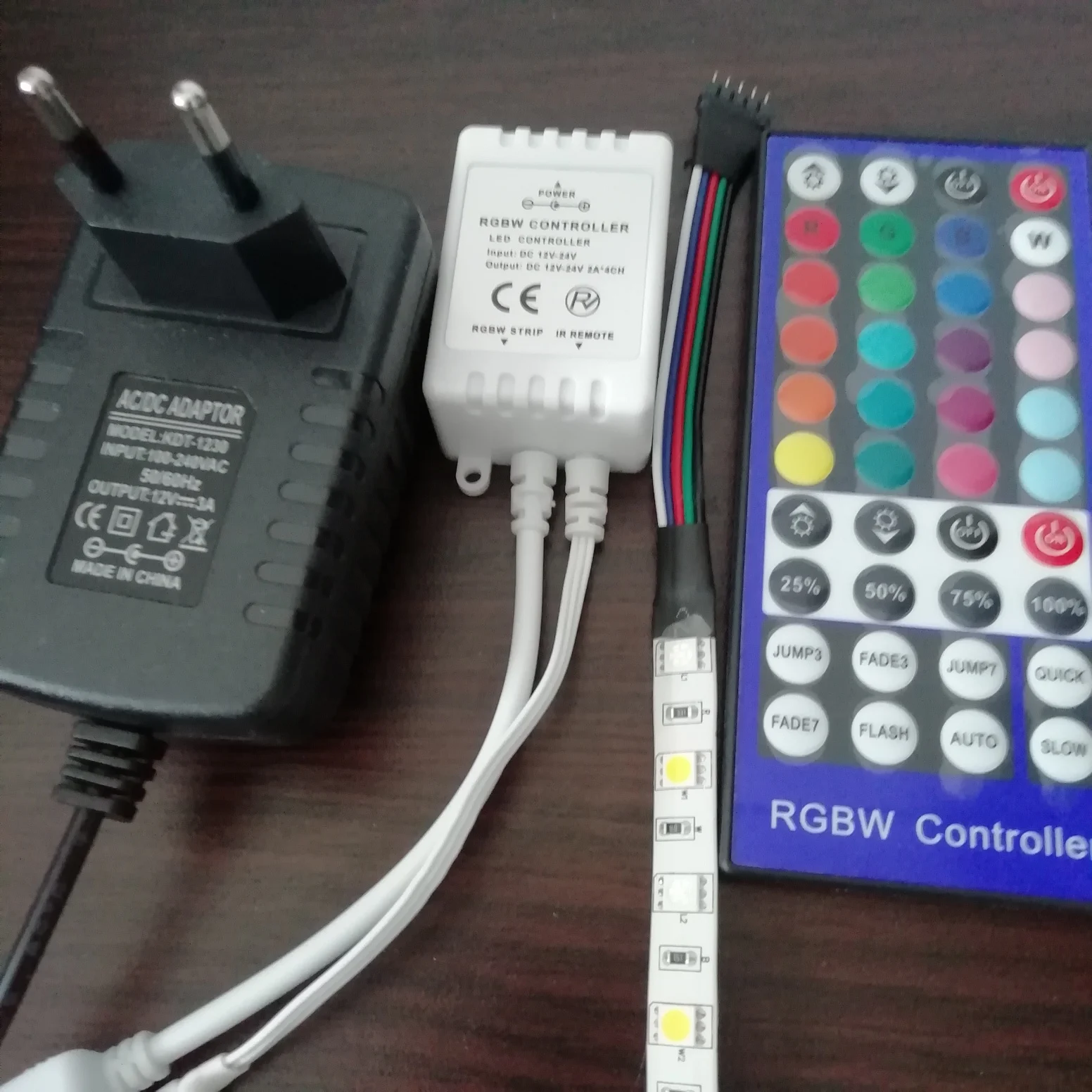 хорошая лента и контроллер. включение и выключение плавное, пультом отдельно управляешь rgb, отдельно белыми светодиодами. можно всё разом включить: rgb и ww белый одновременно дают сине-желтую комбинацию. на блоке питания горит синий индикатор.