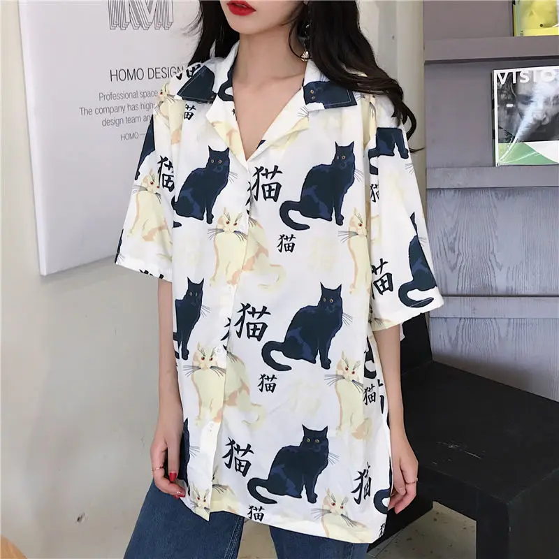 Блузка женская, повседневная, с принтом кота, в Корейском стиле