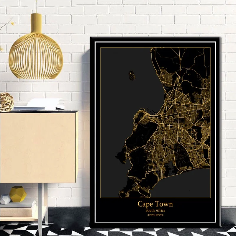 Кейптаун, Южная Африка черный и золотой город светильник Карты изготовленный на заказ карта городов мира Плакаты Печать на холсте Nordic Стиль Wall Art домашний декор