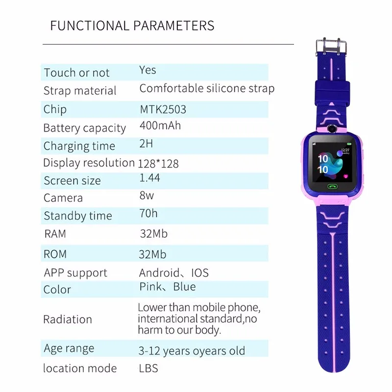 Материал ремешка: удобный силиконовый ремешок Емкость аккумулятора: 400 мА · ч Время зарядки: 2 ч Разрешение дисплея: 128*128 Размер экрана: 1,44 дюйма камера: 8 Вт Время работы в режиме ожидания: 70 ч память: 32 Мб ROM: 32 Мб приложение: supportAndroid, l〇S Цвет: розовый синий излучение: ниже, чем телефон, международные стандарты, Не повредит наше тело. Возраст: от 3 до 12 лет режим положения: LBS