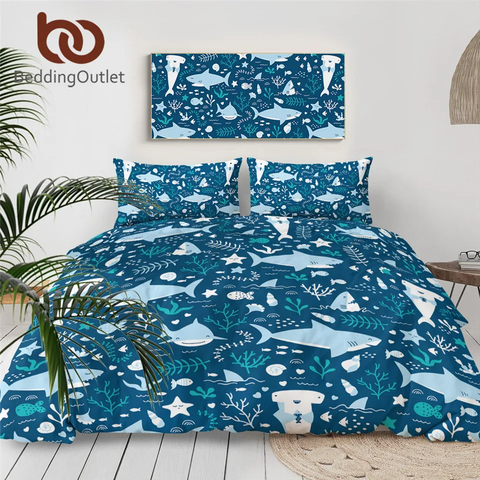 Постельное белье Cute Shark, Комплект постельного белья из 3 предметов, детское одеяло с рыбками из мультфильма, подводное одеяло с животными, водорослями, Океанский синий комплект постельного белья Queen