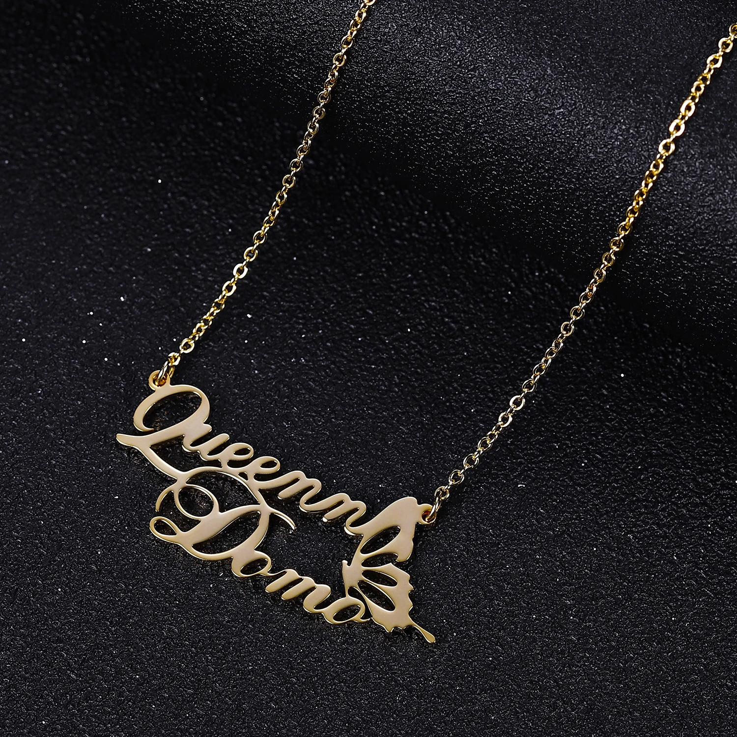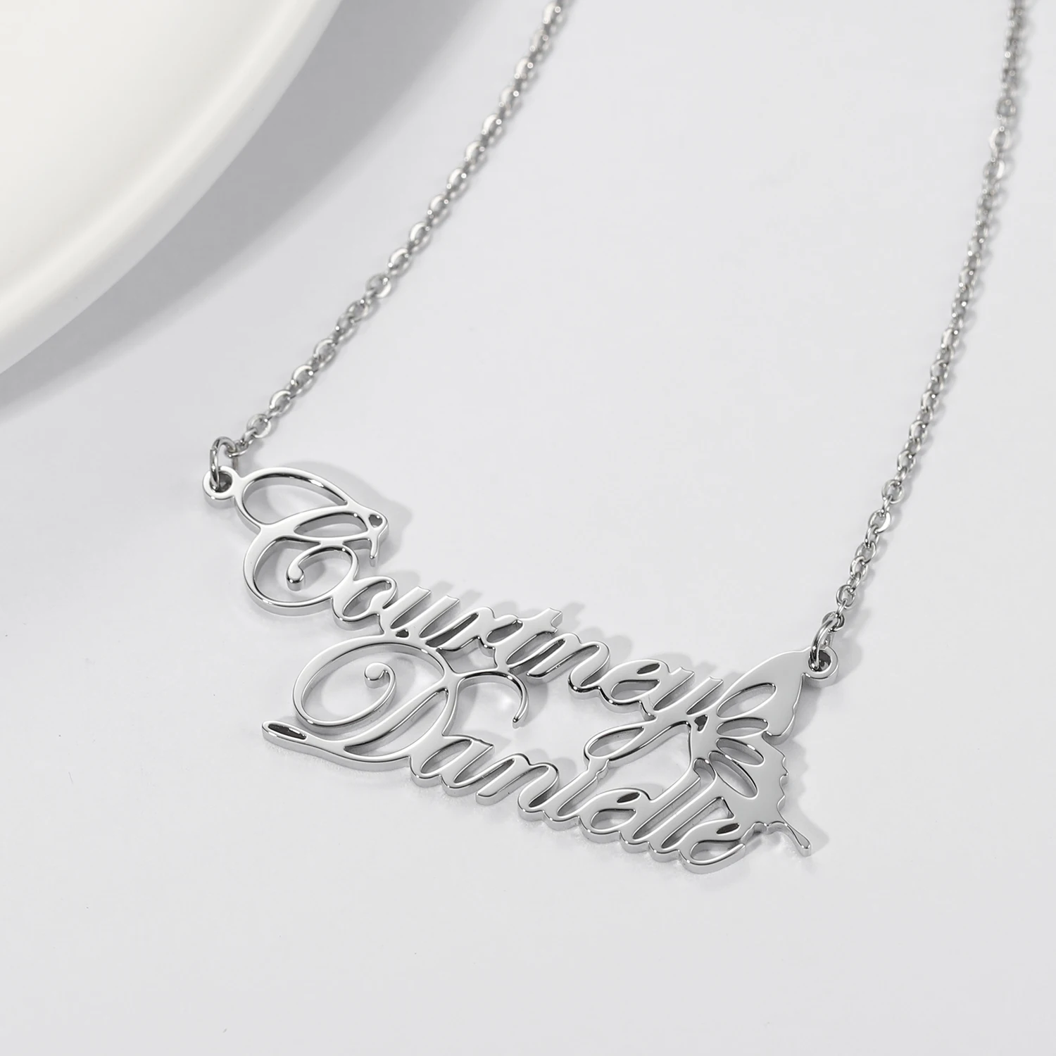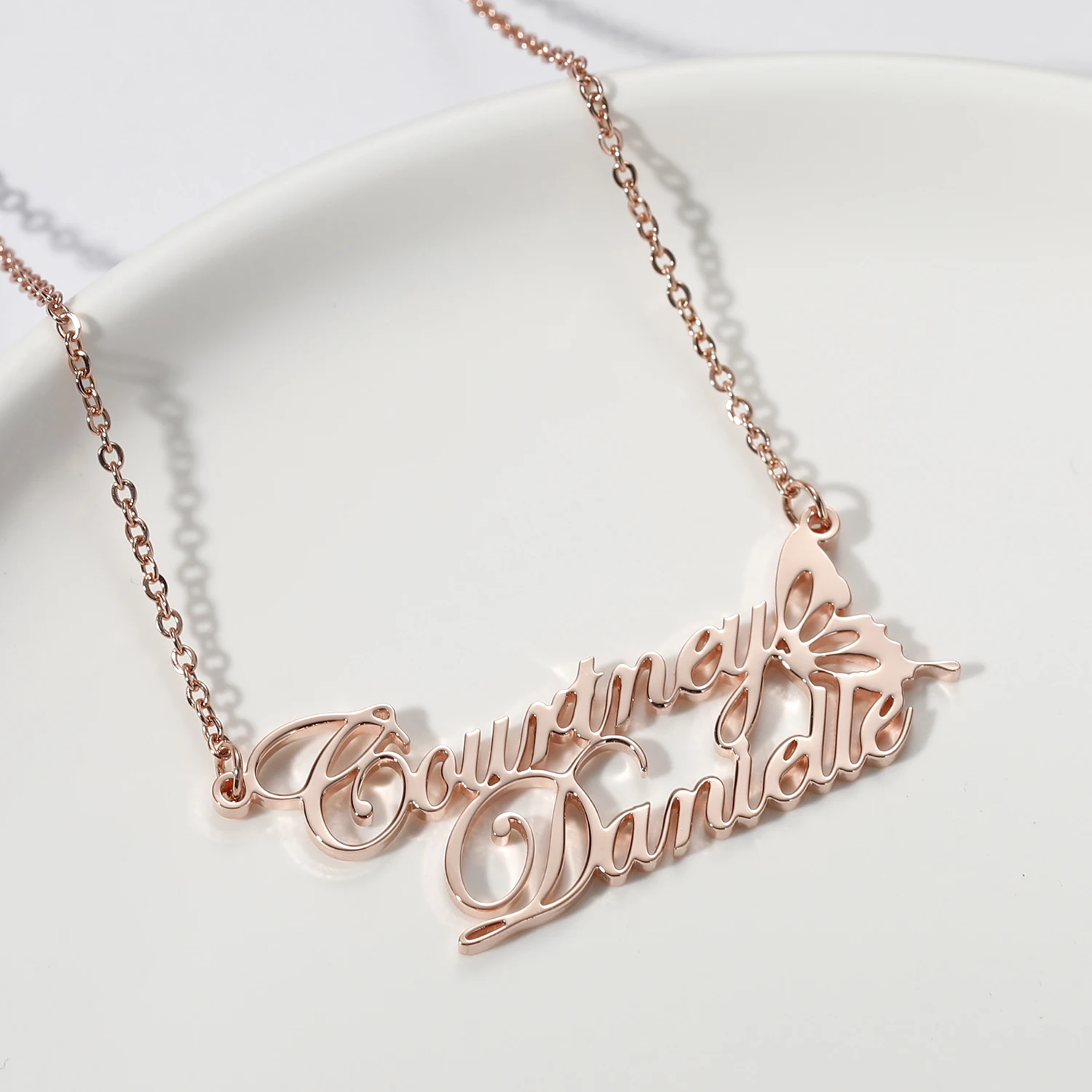 Женское Ожерелье с двойными именами на заказ, подарок, колье из нержавеющей стали, не выцветает, именные подвески, персонализированные ювелирные изделия с сердечками и бабочками