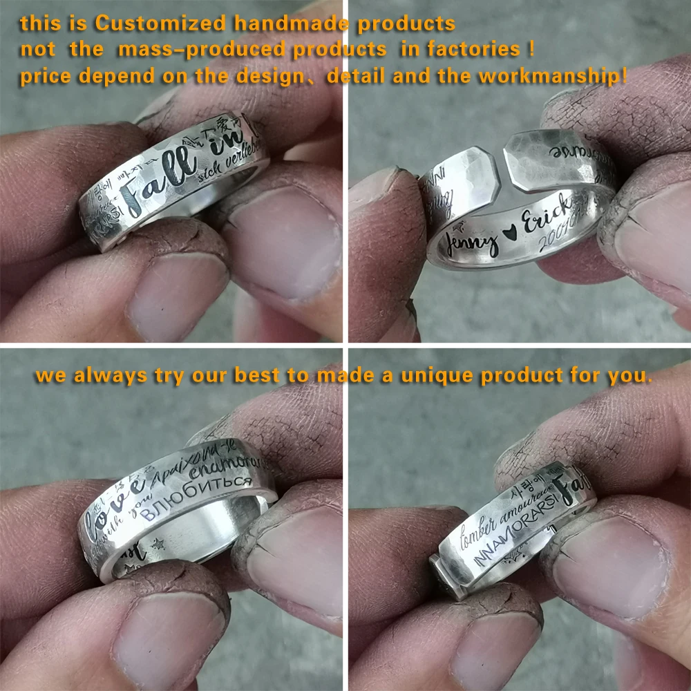 Состояние:Новинка ручной работы с идеальной отделкой Материал:999 Чистое серебро высшего качества (Марка 999 торговой марки) (Мы гарантируем, что это 999 Чистое серебро, если не полный возврат средств!) Размер США:#5 ~#15 Ширина кольца:Прибл.6,5 мм/8,5 мм/10,5 мм Толщина кольца:Прибл.2,2 мм (Изделие ручной работы, ширина и толщина каждый раз будут немного отличаться.) Слова в передней части:Влюбиться(Гравировка на 10 языках) Слова на задней стороне:Отправьте вашИменаИПамятный день.(В противном случае он будет пустым)