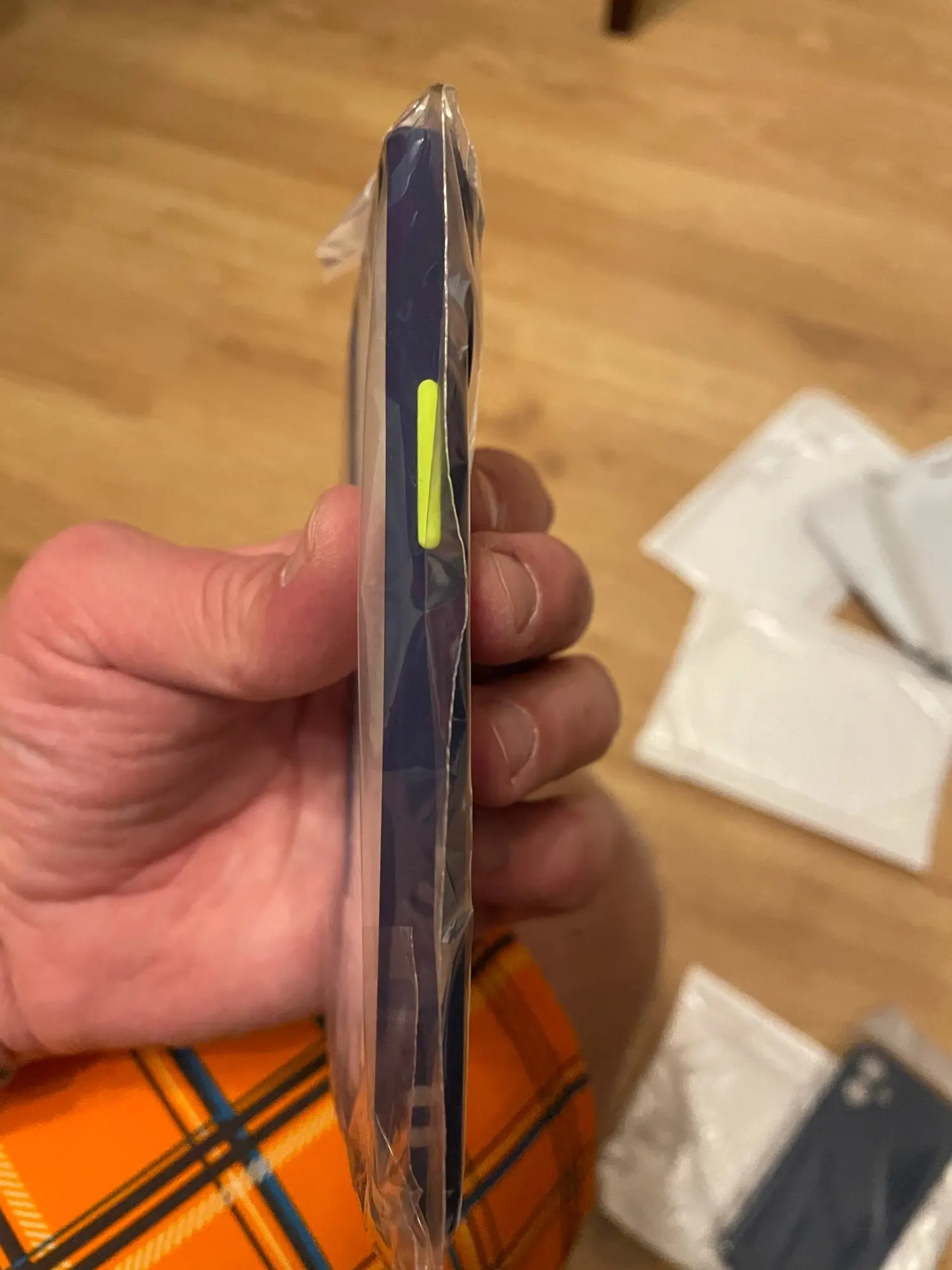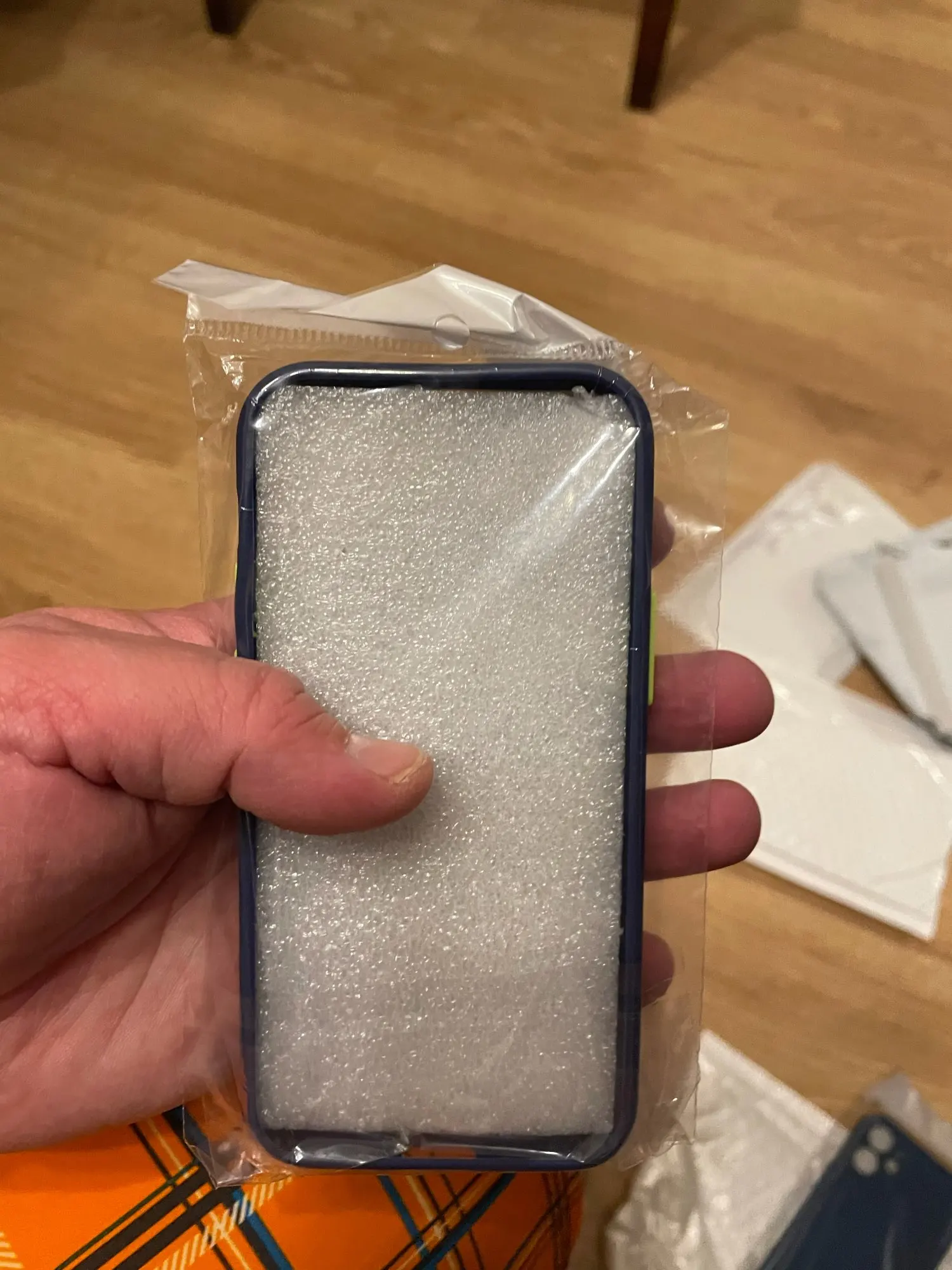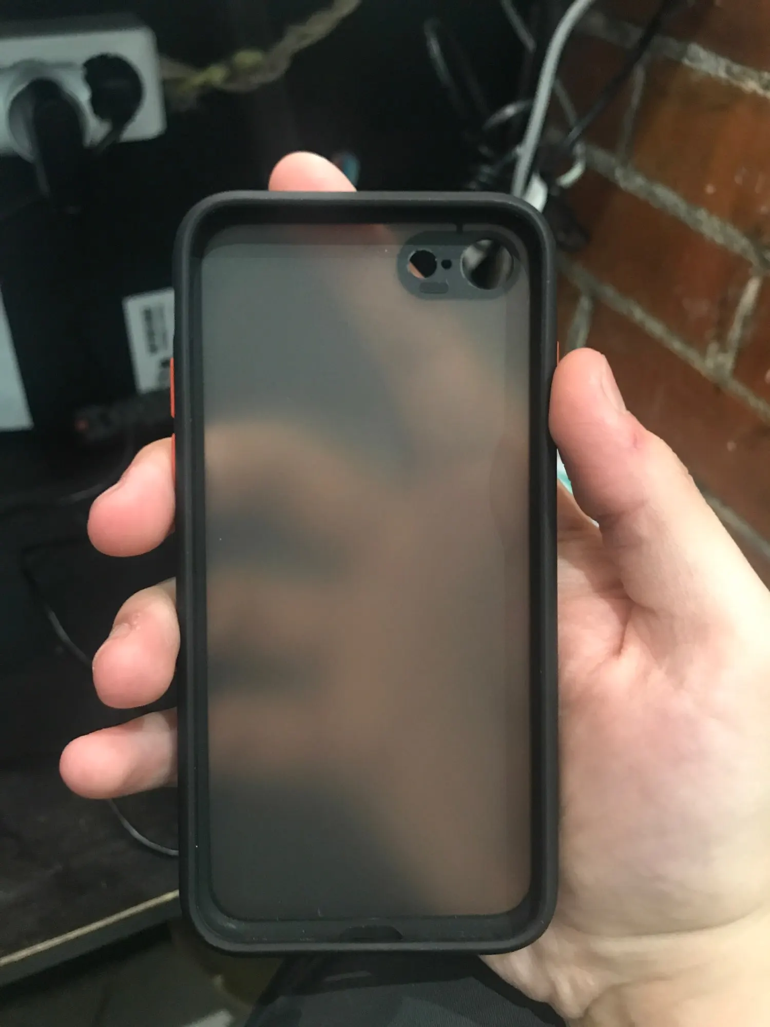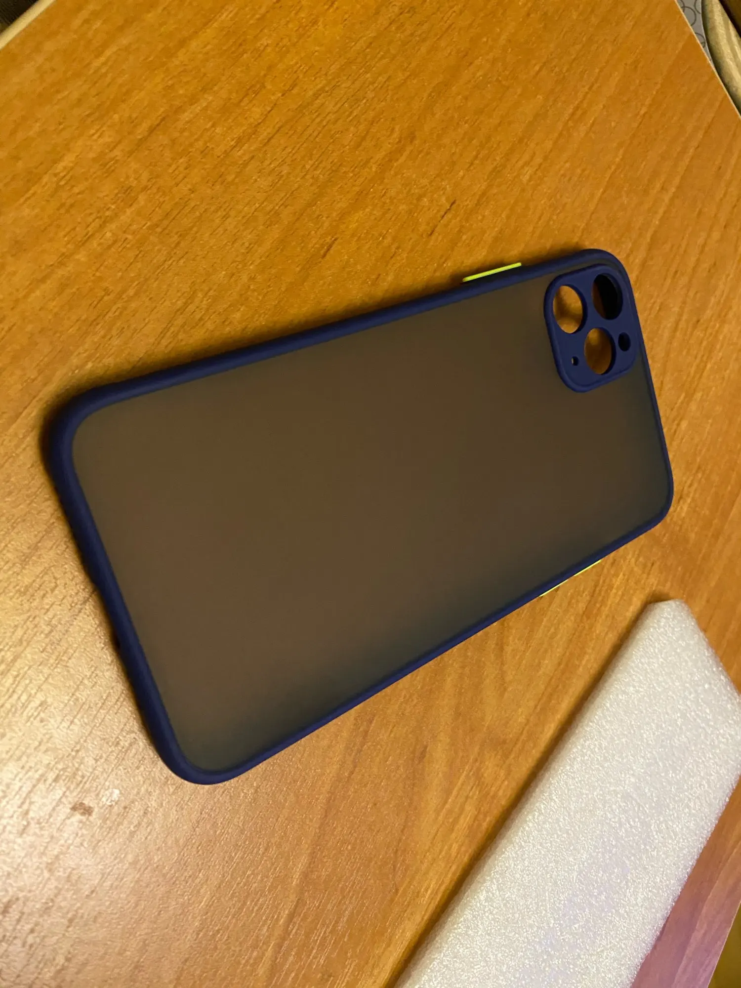 чехол пришел в хорошем состоянии. задняя панель непрозрачная ,а матово-серая. кнопки по бокам ярко -оранжевые.