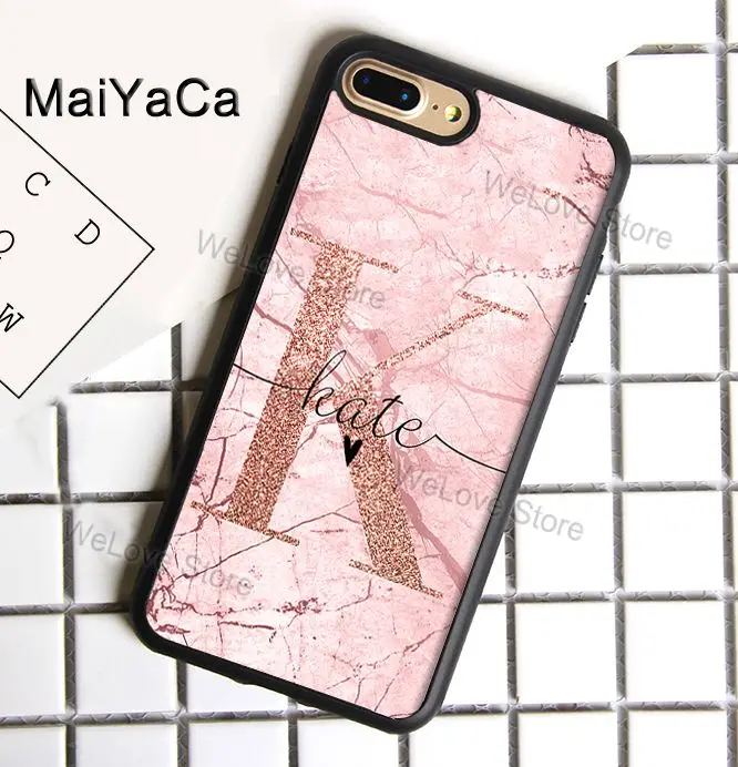 Блестящий розовый золотой мраморный чехол с инициалами имени на зак...