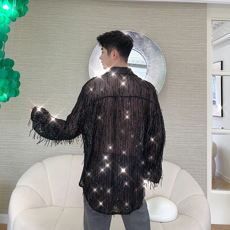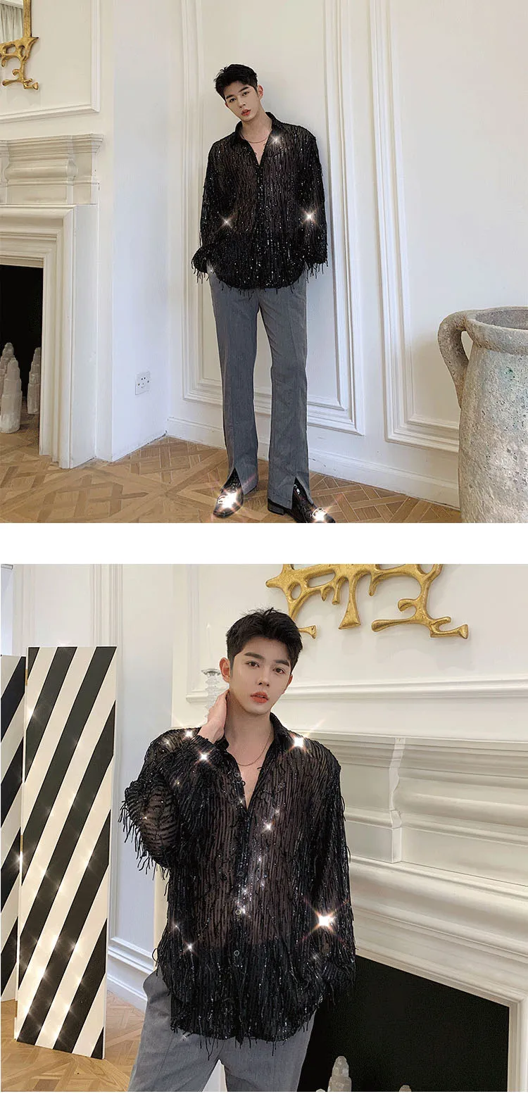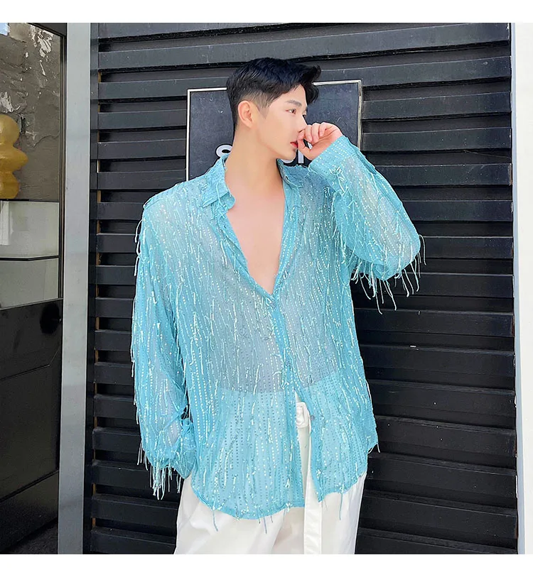 Мужская прозрачная рубашка, с длинным рукавом, с кисточками и блестками, в стиле ретро, уличная одежда, свободная, сценическая, для шоу