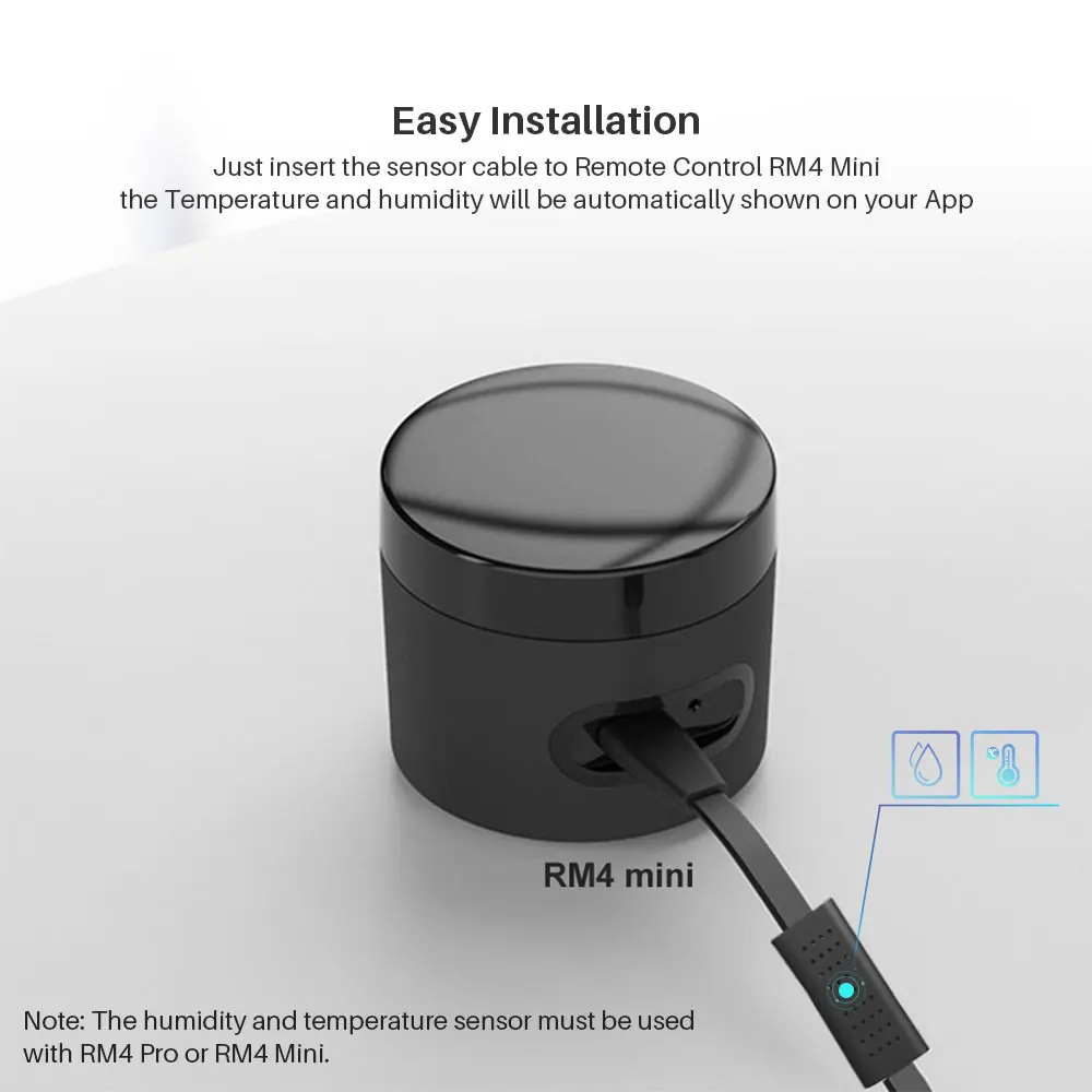 Просто вставьте кабель датчика в пульт дистанционного управления RM4 MiniТемпература и влажность будут автоматически отображаться в вашем приложении