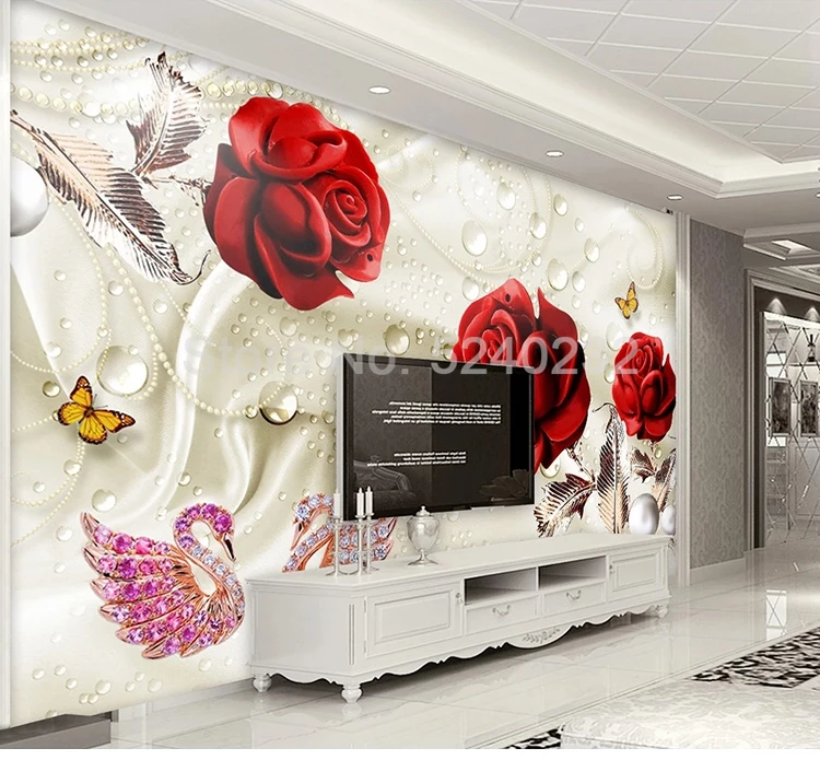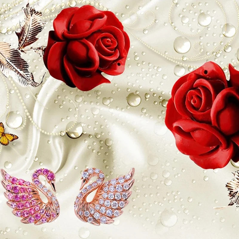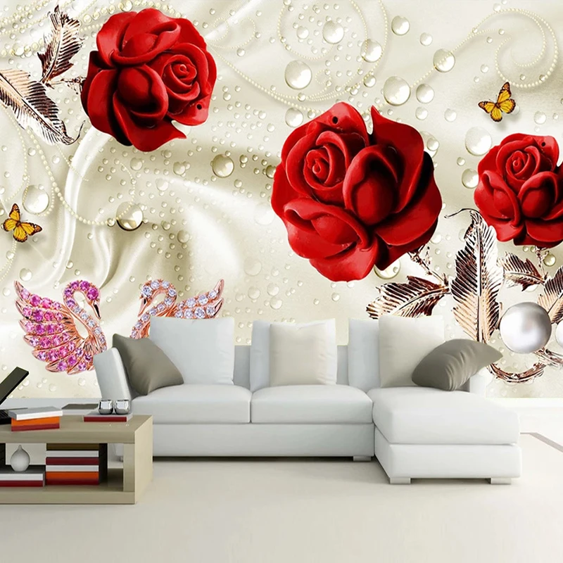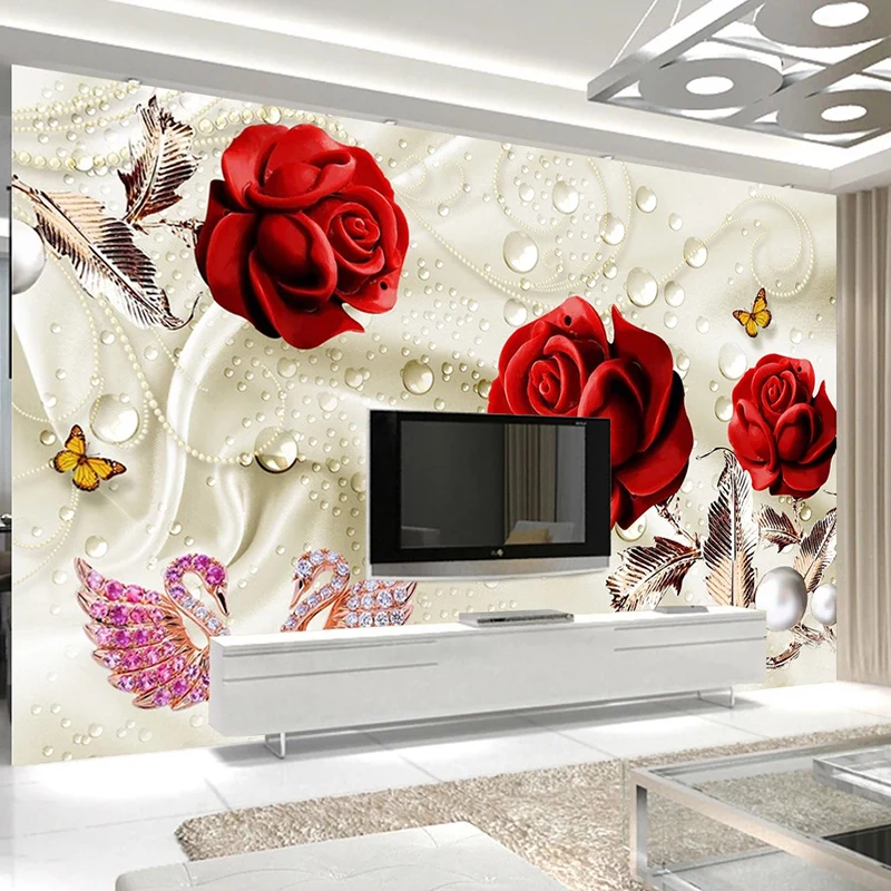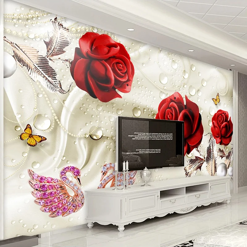 Фото на заказ 3D стереоскопическая красная роза лебедь ювелирные изделия гостиная тв фон настенная роспись водонепроницаемая шелковая ткань обои цветок