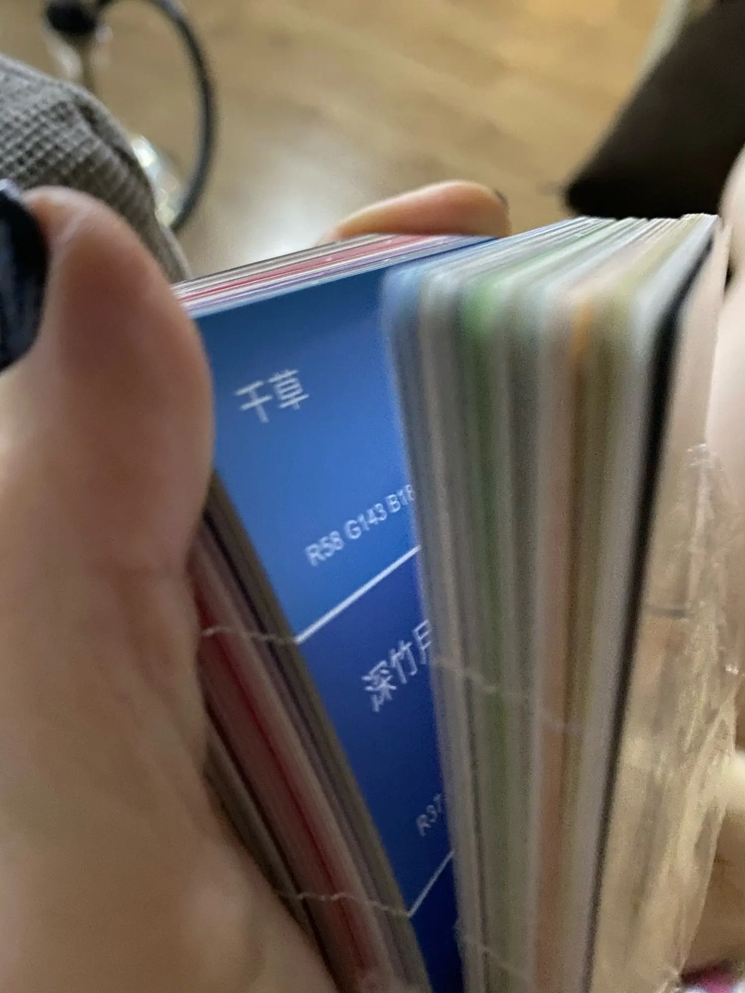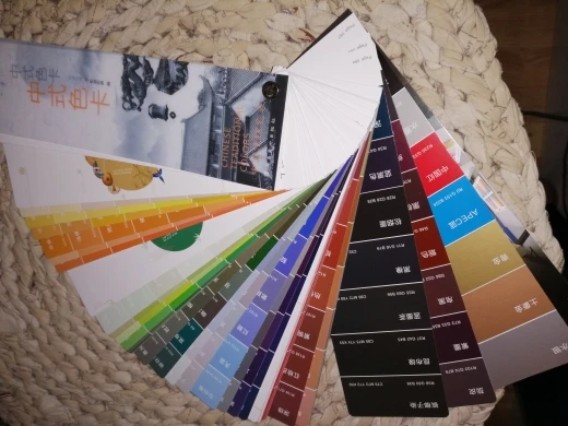 Замечательный веер. Бумага где-то 250 г/м. Цвета разделены по группам - желтые оттенки, зеленые,синие, красные, коричнево-черные. Каждый оттенок подписан RGB и CMYK. Шаг в RGB и CMYK неравномерный, просто цвета подобраны по сходности и, видимо, просто взяты по распространенности названий в китайском языке.