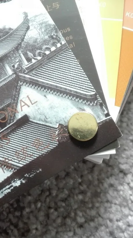 Получил палочки для китайского традиционного цвета. Содержимое было очень хорошо защищено в пузырчатой пленке. Просматривая буклет, он имеет цифровые и аналоговые рекомендации для производства цвета. Цифровой компонент RGB цифровой печати в то время как аналог является закупкой CMYK Изготовление и печать пластин. Буклет связывается одним латунным винтом, это позволяет легко визуально и рецепт определенного цвета .... Связь продавцов была отличной. Этот продукт очень прост в использовании. Рекомендовать продавцу.