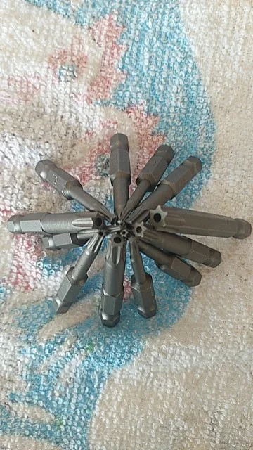 Доставка обычная , в Москву около месяца. Материал не пластилин, но мягче стали S2. Крутил Т20 и Т25 нержавеющих винты из нержавейки, жёстко, не свернулись, хотя концы стали более блестящими. Если не промахиваться с размером, то думаю поживут для не постоянного использования. У меня за сотню винтов износа не выявлено. На последнем фото S2 бита светлее и чище обработана.