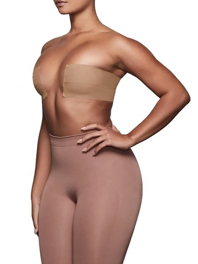 Как на картинке. Что касается клея, вам нужно больше лент, чтобы получить полную поддержку для тех, кто большой грудь. Это определенно делает свою работу.
