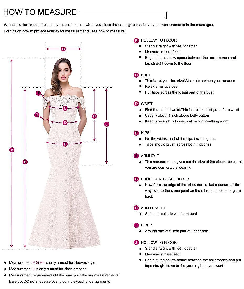 Примечание: Если вам нужно сделать заказ, пожалуйста, выберите любой стандартный размер при заказе, затем напишите ваши измерения в коробке сообщений при оплате в соответствии со следующим методом измерения платья.