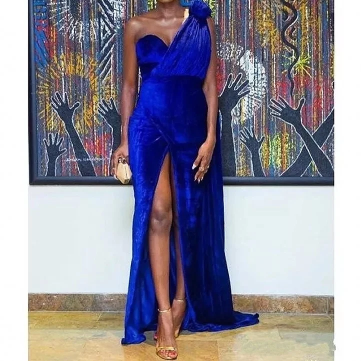 Женское вечернее платье на одно плечо, длинное бархатное платье ярко-синего цвета с открытым плечом в стиле Звезд Гаги, для вечевечерние, выпускного вечера